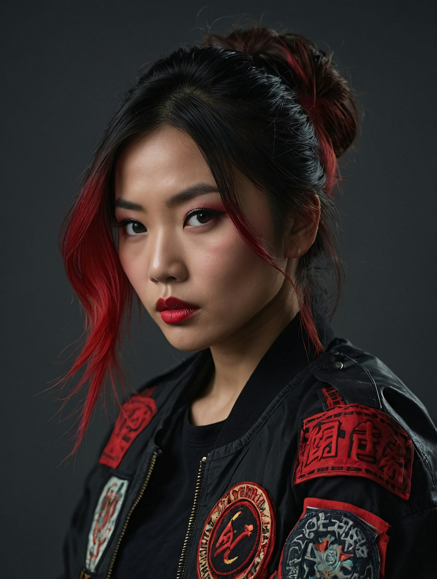 Asian woman with red highlights and bold makeup in a black jacket with patches, exuding a fierce and edgy style.