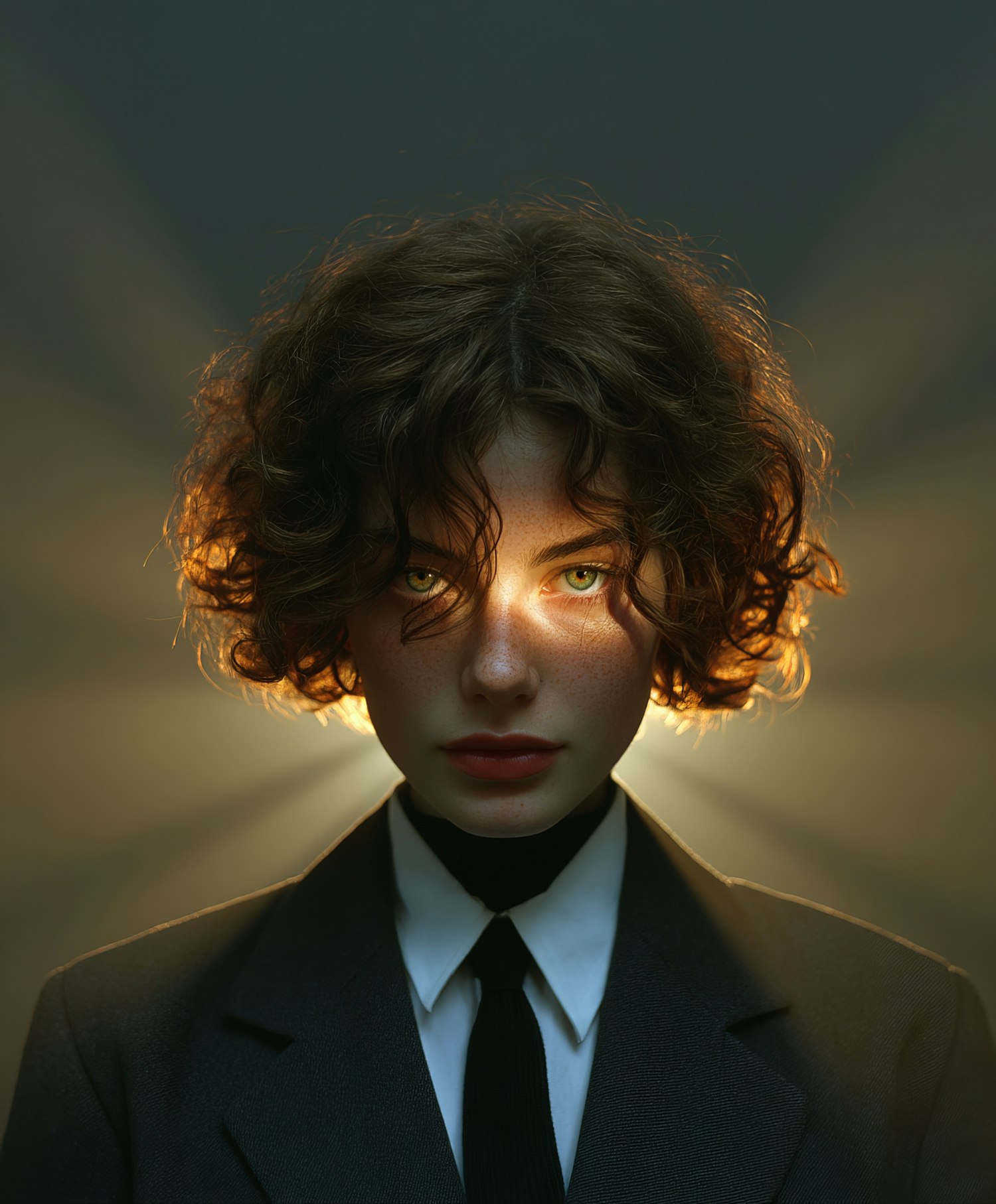 A striking portrait of a person with curly hair and green eyes, illuminated by dramatic backlighting, creating a captivating visual effect.