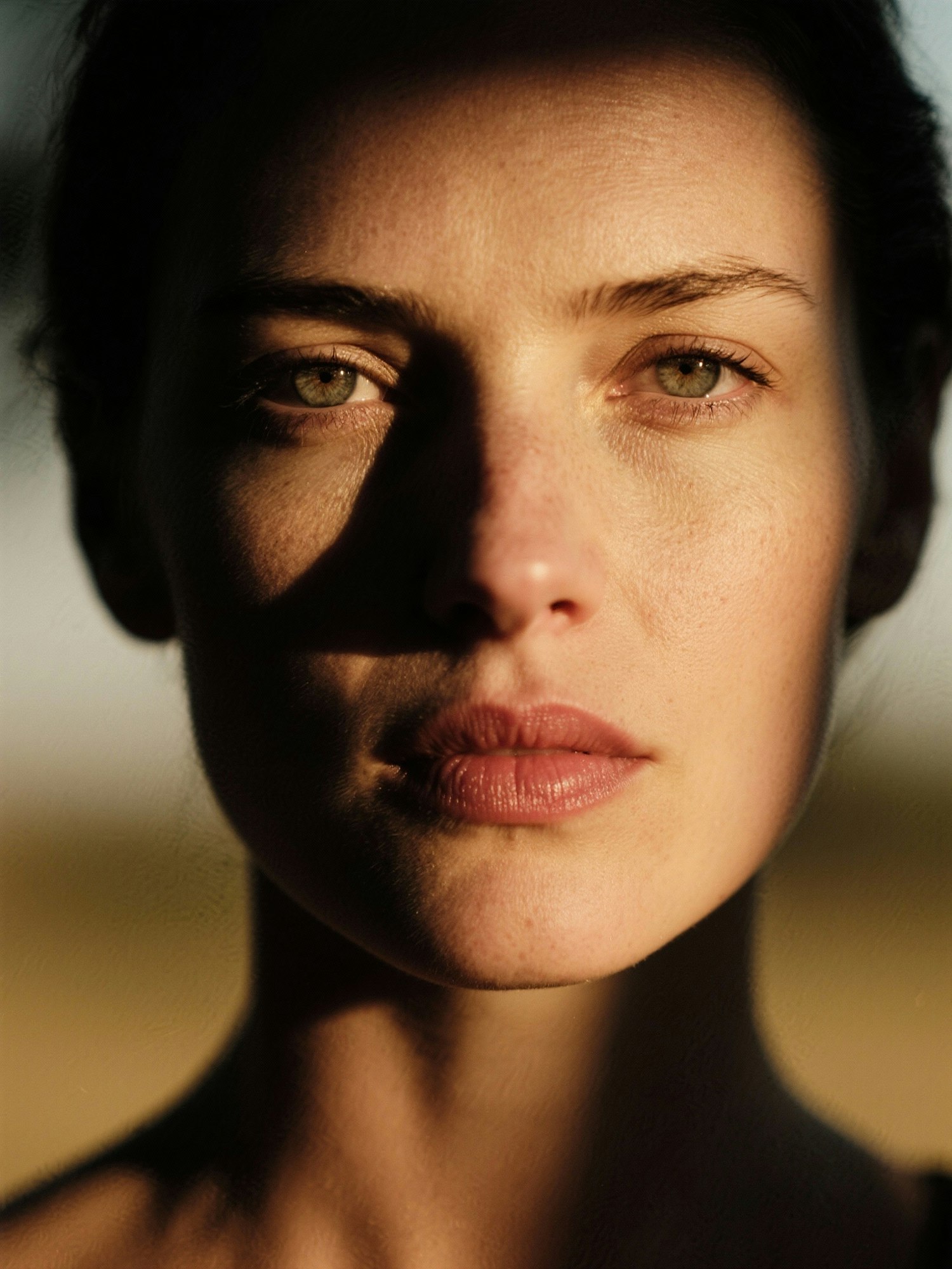 Ultra-realistic cinematic portrait of a woman, dramatic chiaroscuro lighting, half of face in deep shadow, golden sunlight highlighting skin, soft blurred background, sharp eyes and lips, natural skin texture, 85mm DSLR photography, shallow depth of field, film grain, high contrast, moody atmosphere --ar 4:5 --v 6 --q 2 --style raw