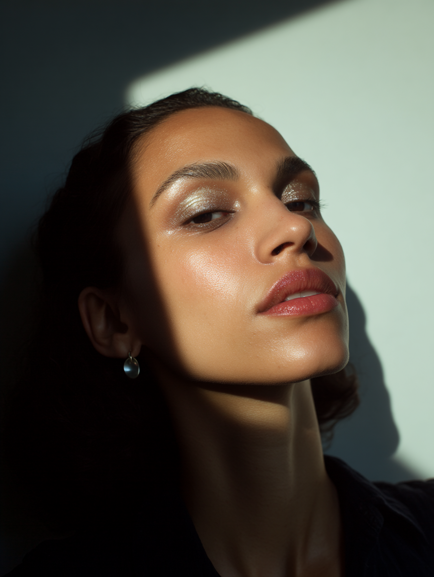 Close-up of a woman with glowing skin, silver eyeshadow, and pearl earring, bathed in dramatic natural light and shadows.