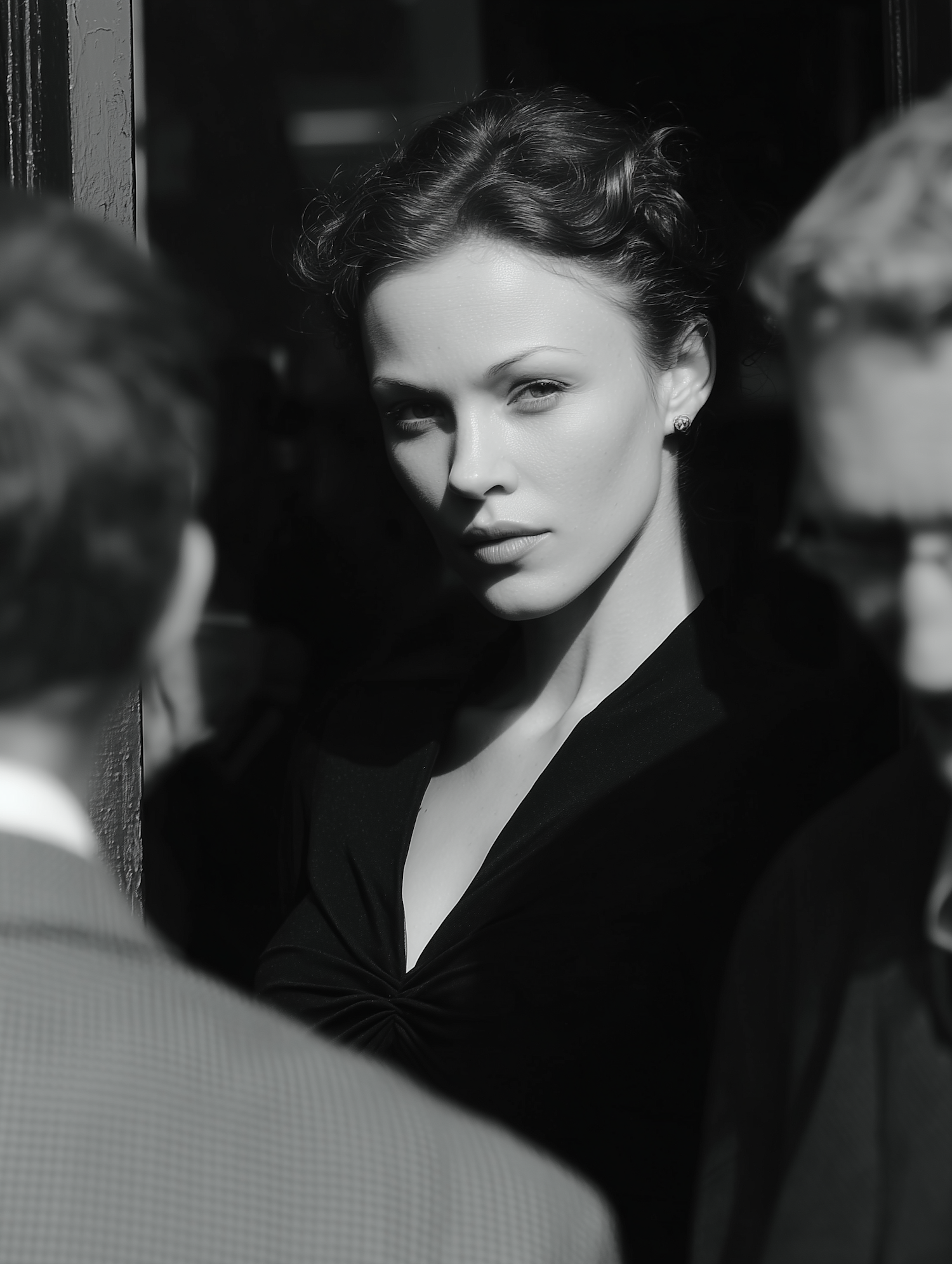 Black-and-white portrait of a woman with dramatic lighting, surrounded by blurred figures, creating a striking and mysterious atmosphere.