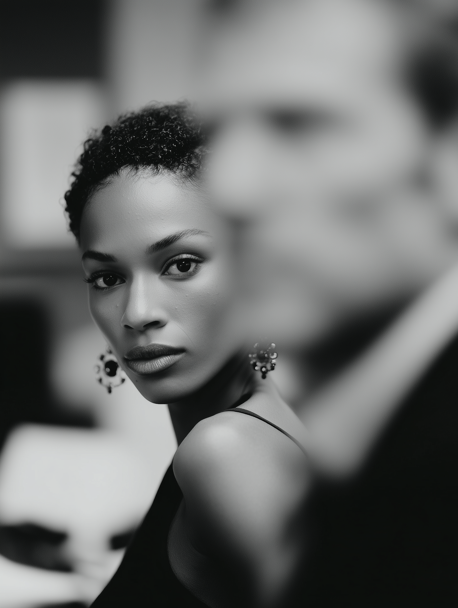 Black and white portrait of a woman with short hair and elegant earrings, gazing intensely, with a blurred figure in the foreground.
