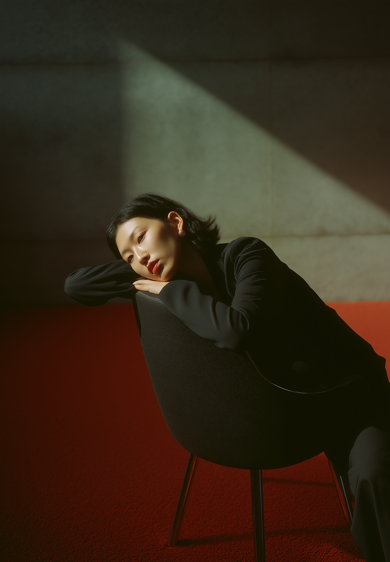 A woman in a black outfit leans on a chair in dramatic lighting, set against a gray wall and red carpet for a minimalist, artistic vibe.