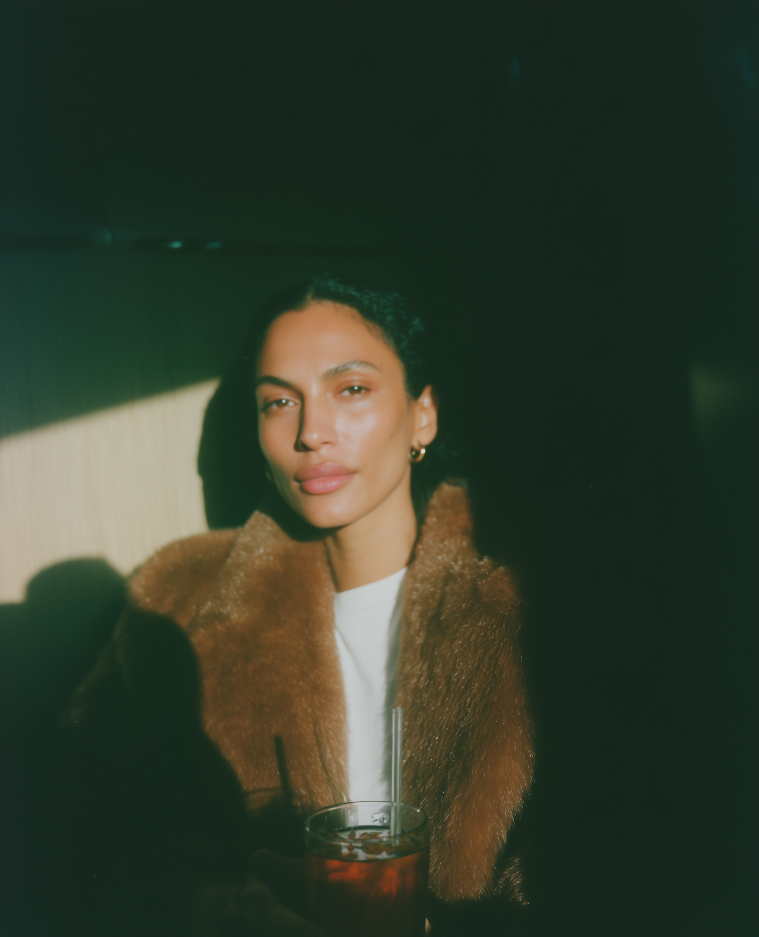 A person in a fur coat holding a drink, illuminated by soft light in a dim setting, creating a dramatic and intimate atmosphere.