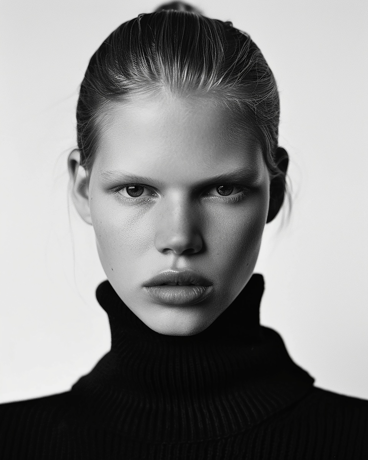 Black and white portrait of a young woman with intense gaze, wearing a high-necked black sweater. Dramatic lighting highlights her features.