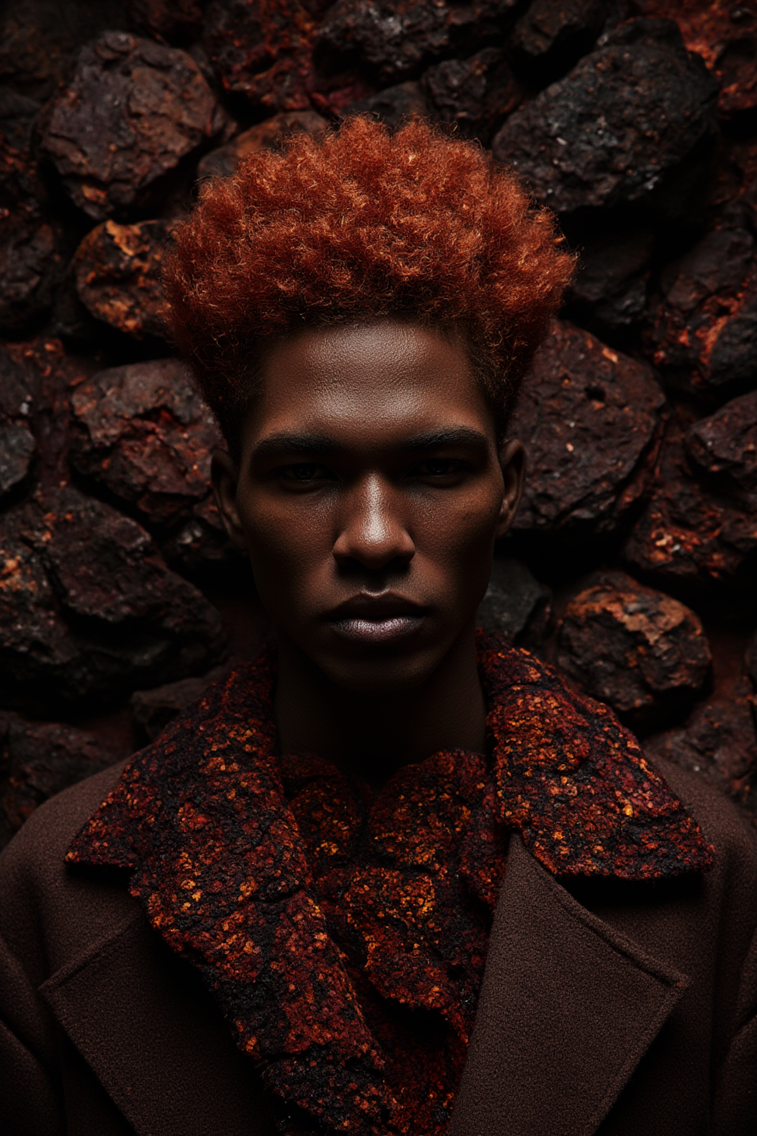 Striking portrait of a person with red curly hair and a textured brown coat, set against a rugged rock background.