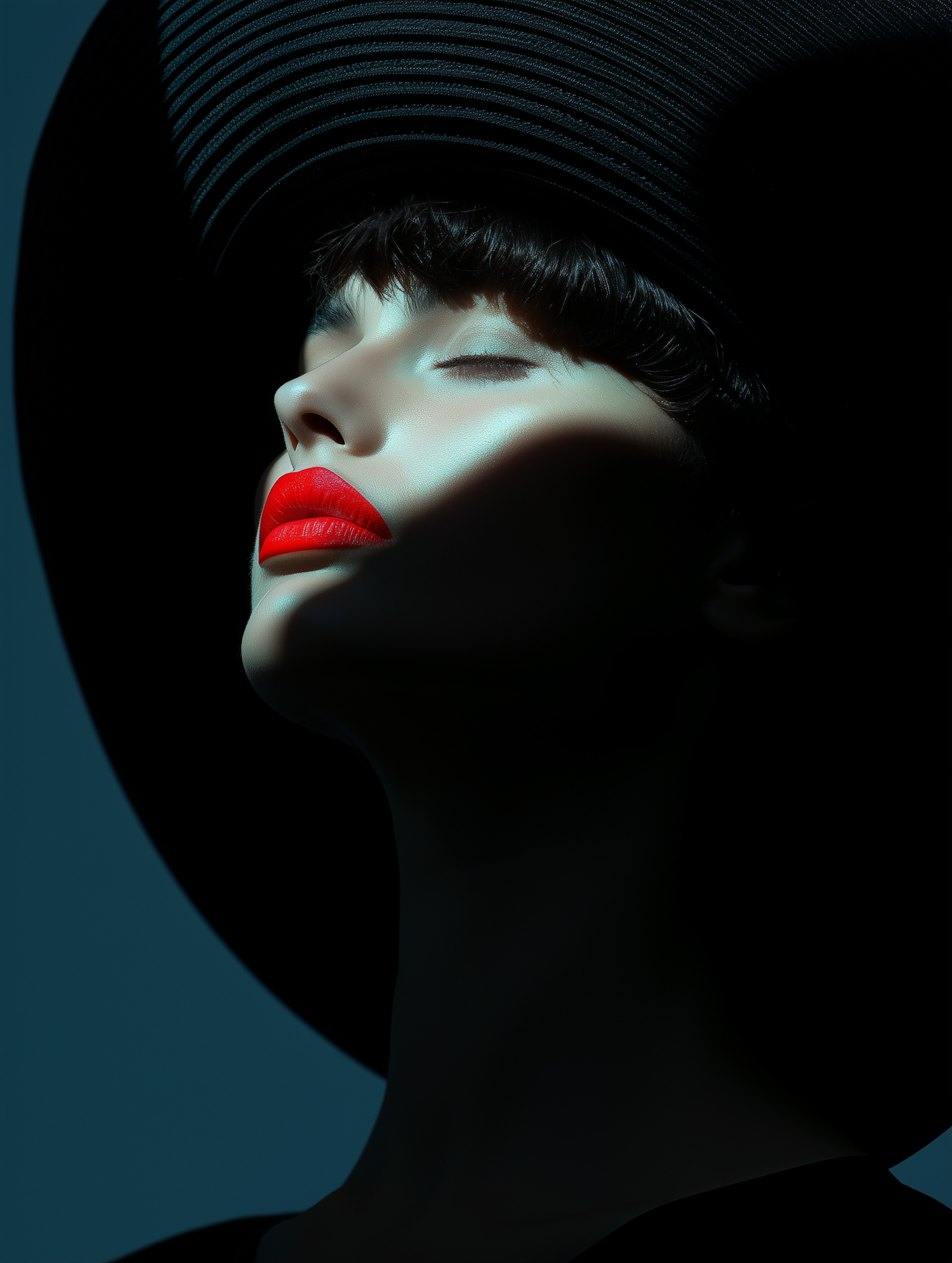 Elegant portrait of a woman in a black hat with bold red lips, dramatic shadows, and a muted teal background.