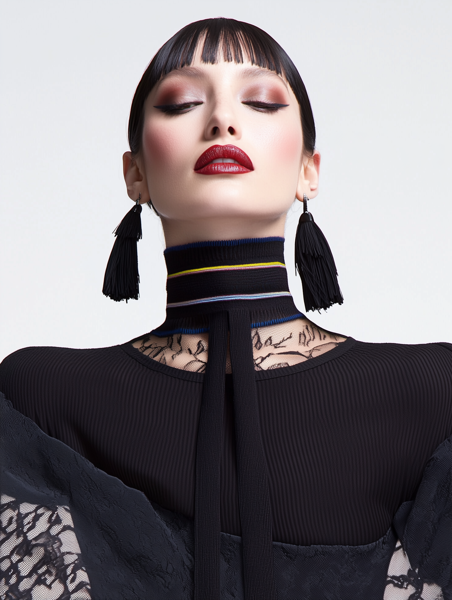 Fashion portrait of a woman with bold makeup, tassel earrings, and a striped choker, exuding elegance and modern style.