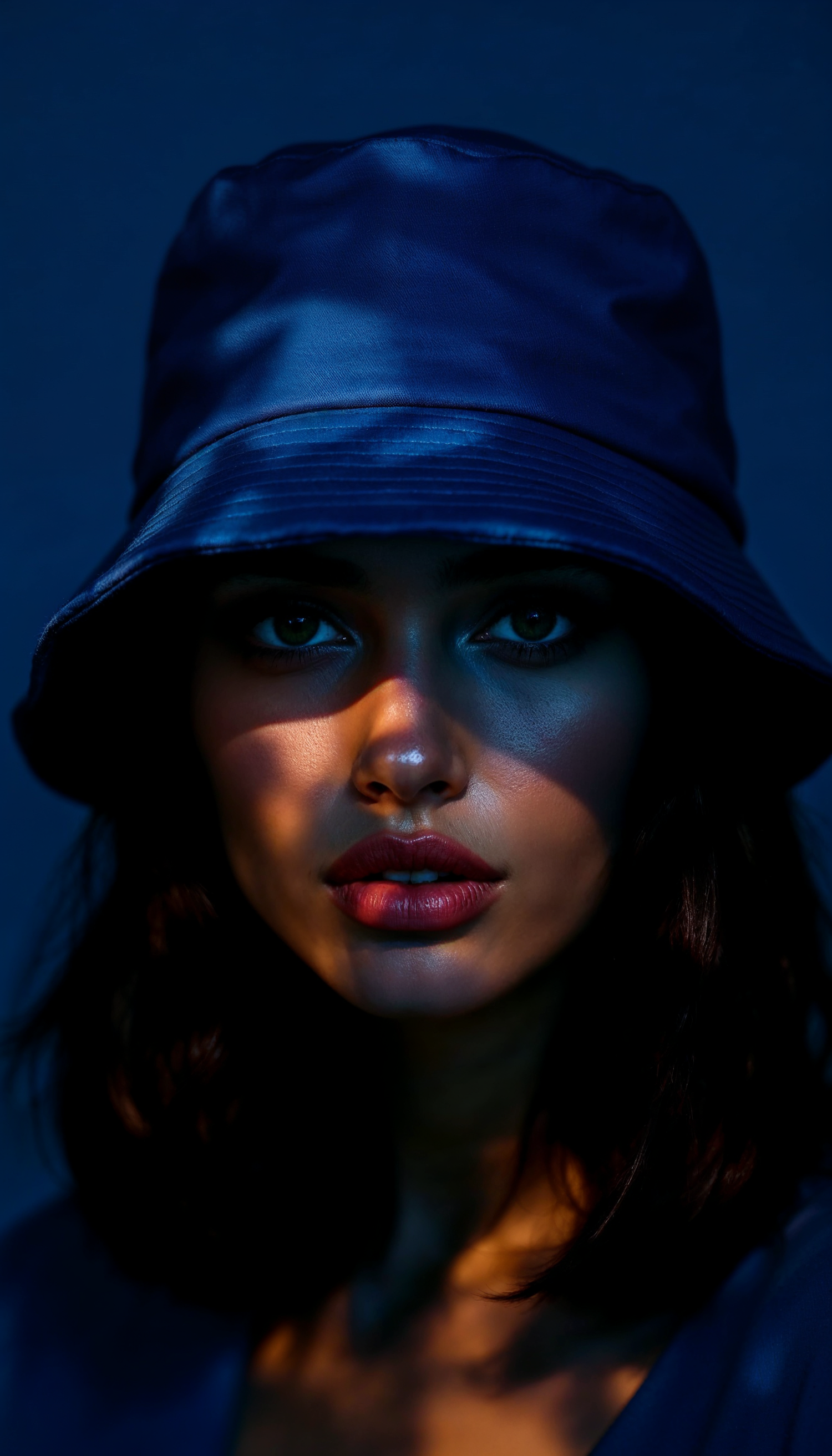 Mysterious portrait of a woman in a blue bucket hat with dramatic lighting and shadows, creating an alluring and captivating mood.