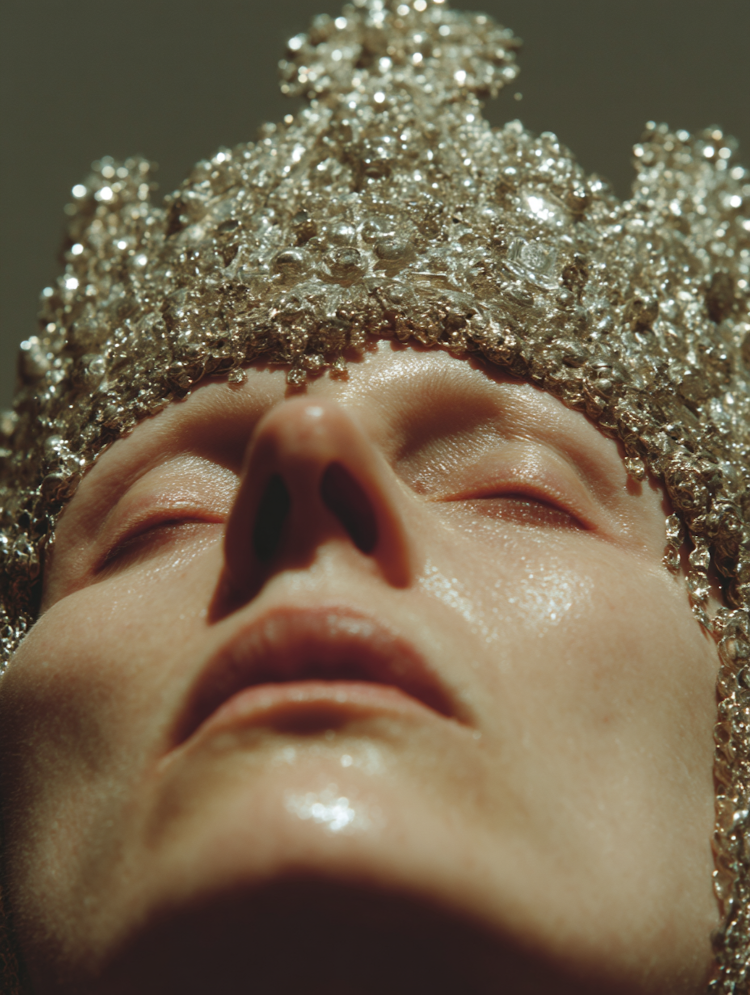 Close-up portrait of a person wearing a sparkling, textured crown, their face dramatically lit for an artistic effect.