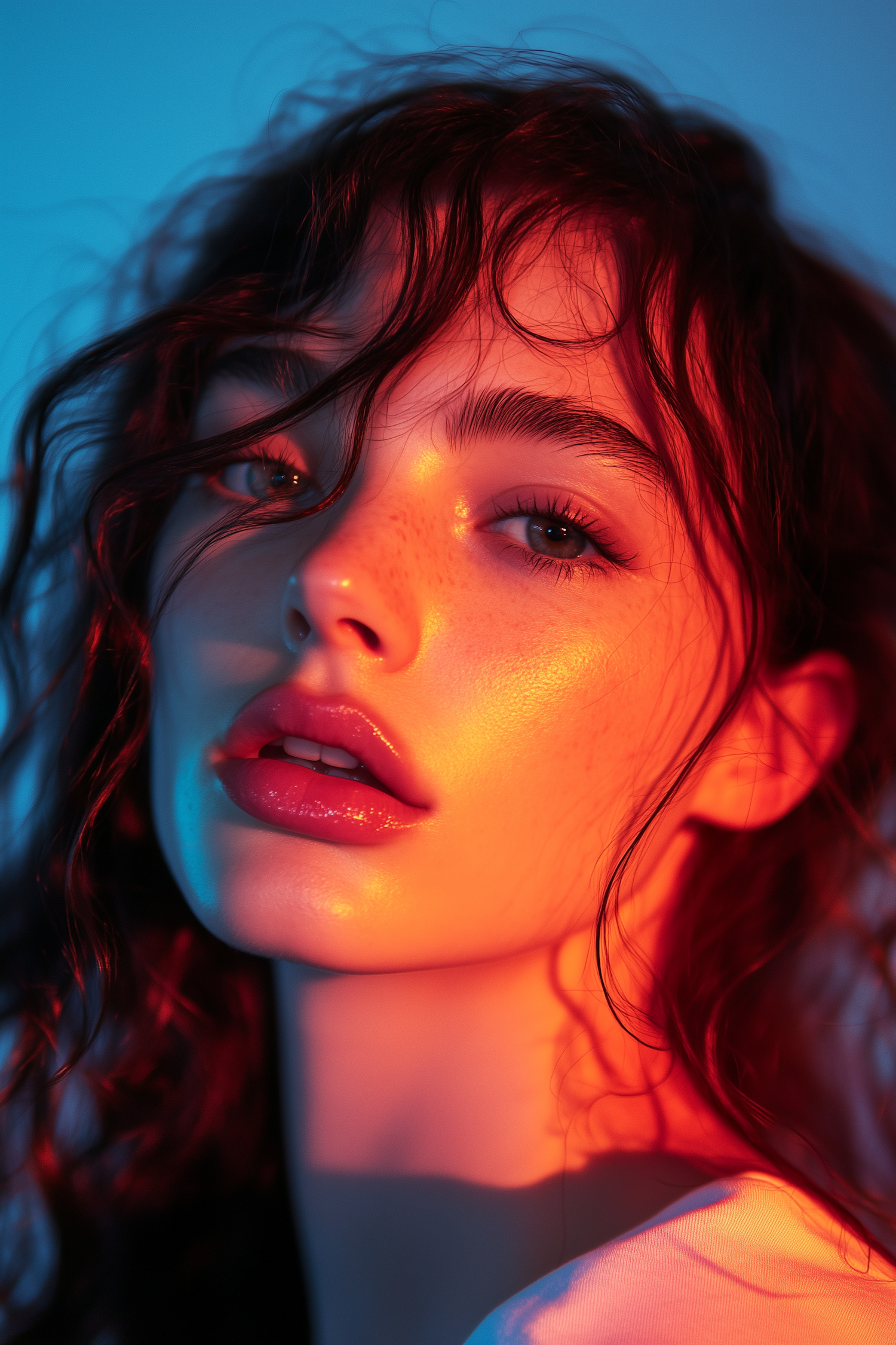 Close-up portrait of a woman with dramatic lighting, featuring warm orange and cool blue tones, highlighting her striking features.