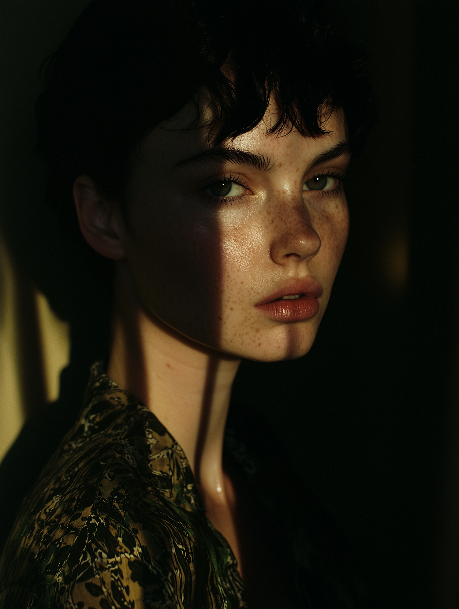 Portrait of a young woman with freckles and short dark hair, highlighted by dramatic lighting and shadows.