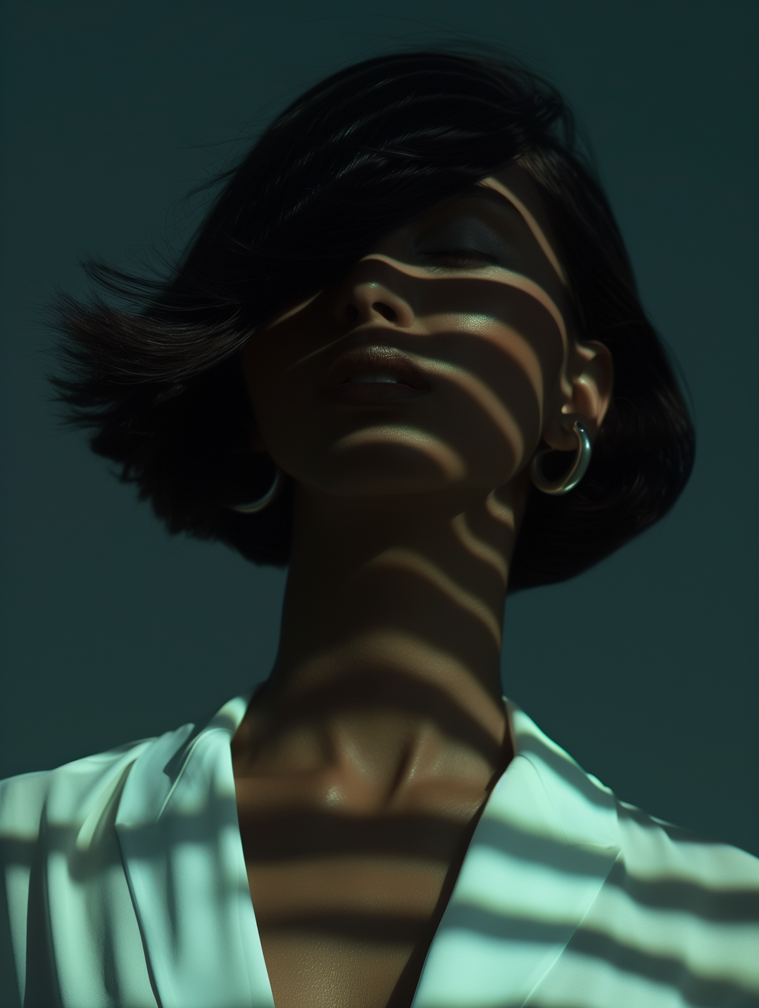 Dramatic portrait of a woman with shadows and stripes on her face, wearing hoop earrings and a white blouse against a green background.
