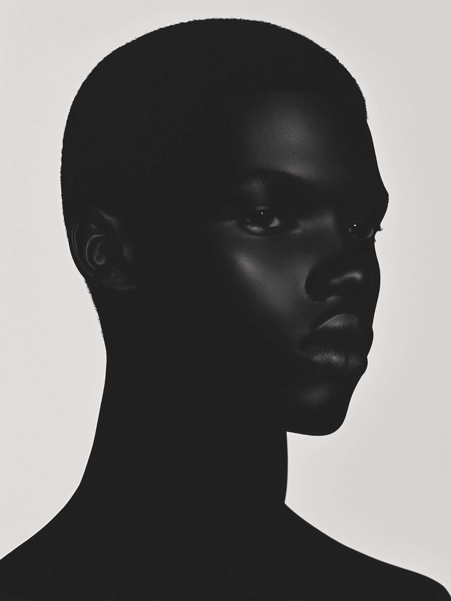 Dramatic portrait of a person with dark skin, highlighted by contrasting lighting and a neutral expression, set against a plain background.