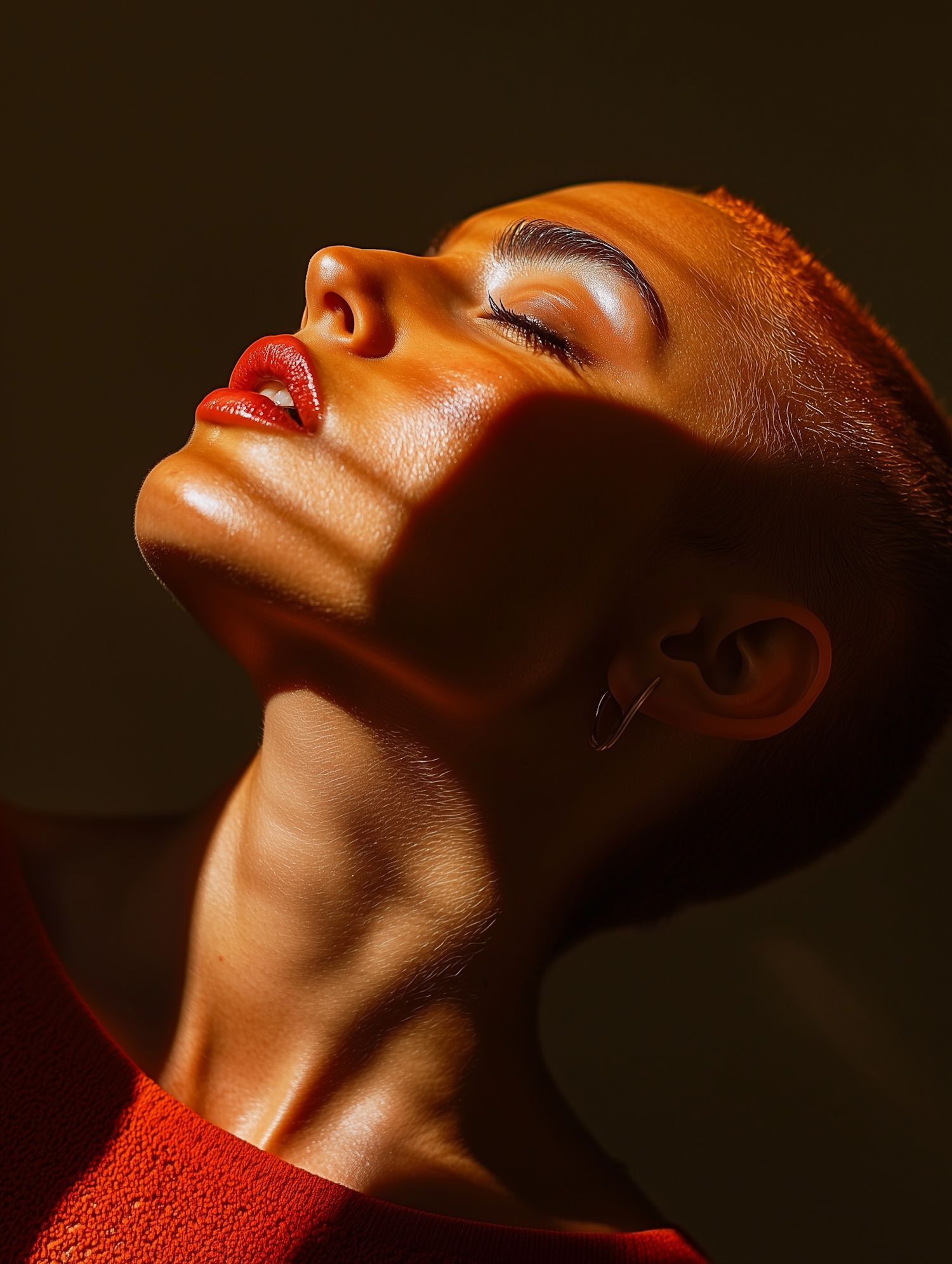 Close-up portrait with dramatic lighting, highlighting serene expression, red lipstick, and textured red garment against a dark background.