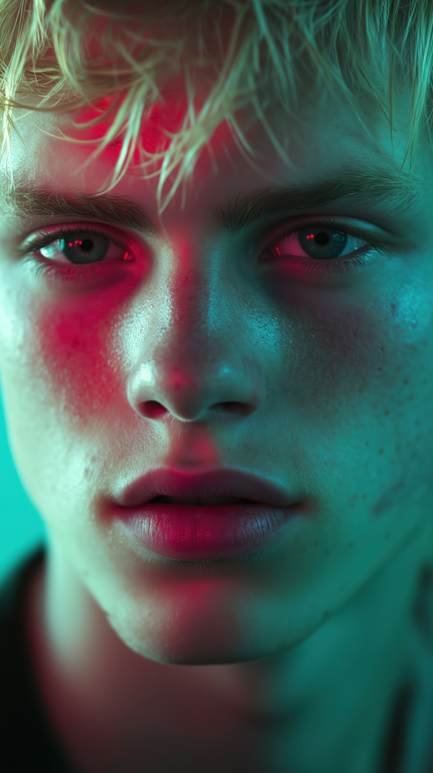 Close-up portrait of a young man with dramatic red and teal lighting, highlighting his blue eyes and blonde hair.