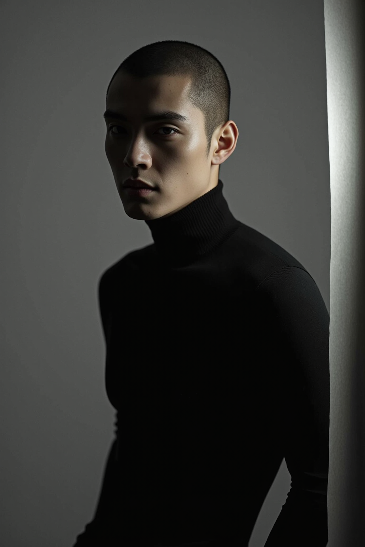 Dramatic portrait of a young man in a black turtleneck, with intense lighting and shadows creating a mysterious atmosphere.
