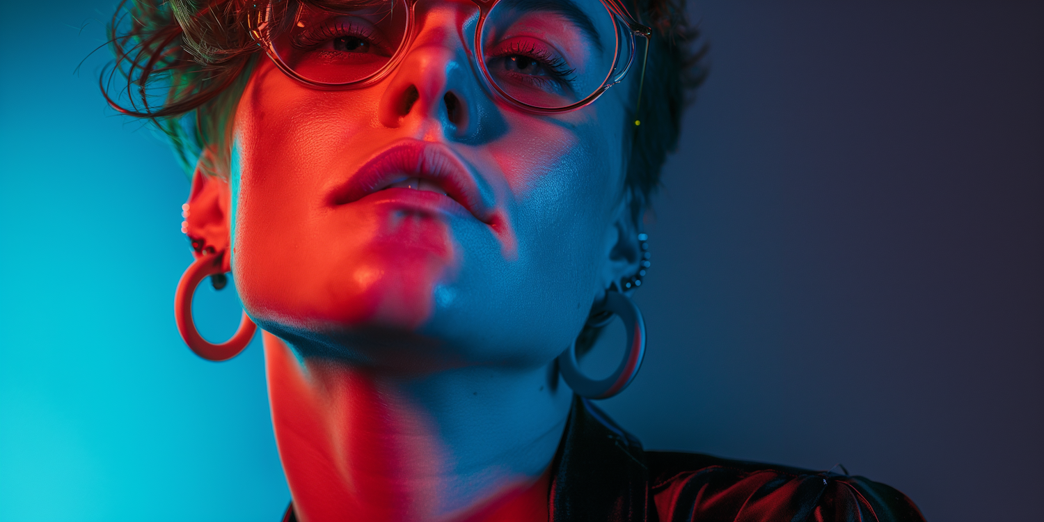 Close-up of a stylish person with glasses and hoop earrings, illuminated by bold red and blue lighting for a dramatic, modern look.