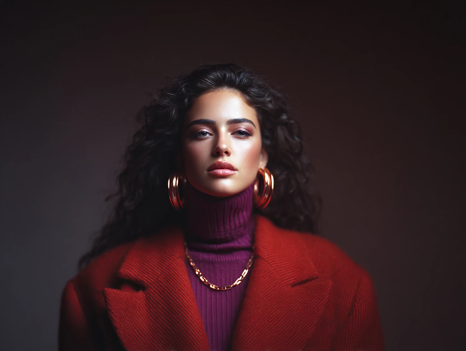 Portrait of a woman in a red coat and purple turtleneck, accessorized with gold jewelry, set against a dark background.