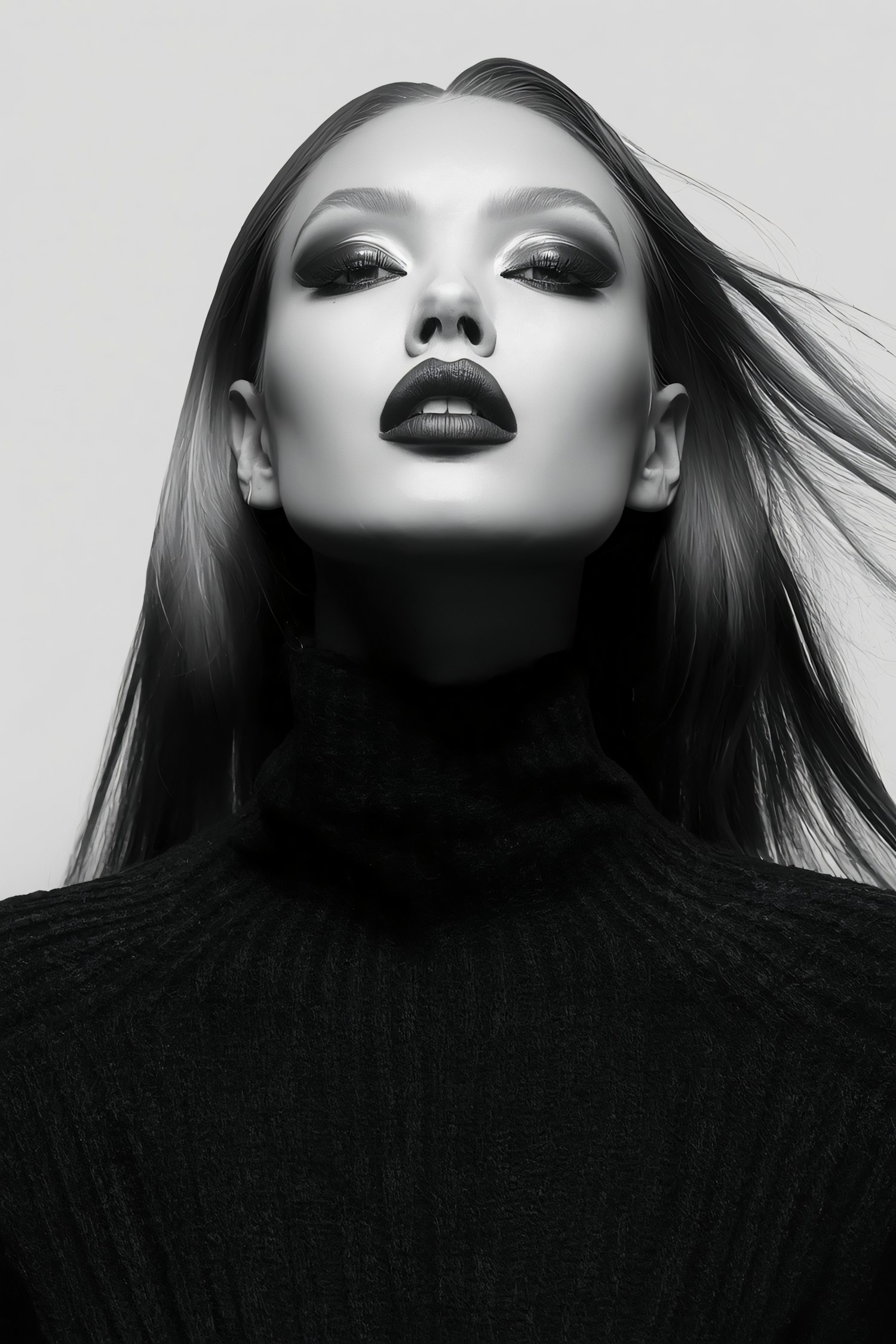 Monochromatic portrait of a person with bold makeup, flowing hair, and a textured black outfit against a plain background.