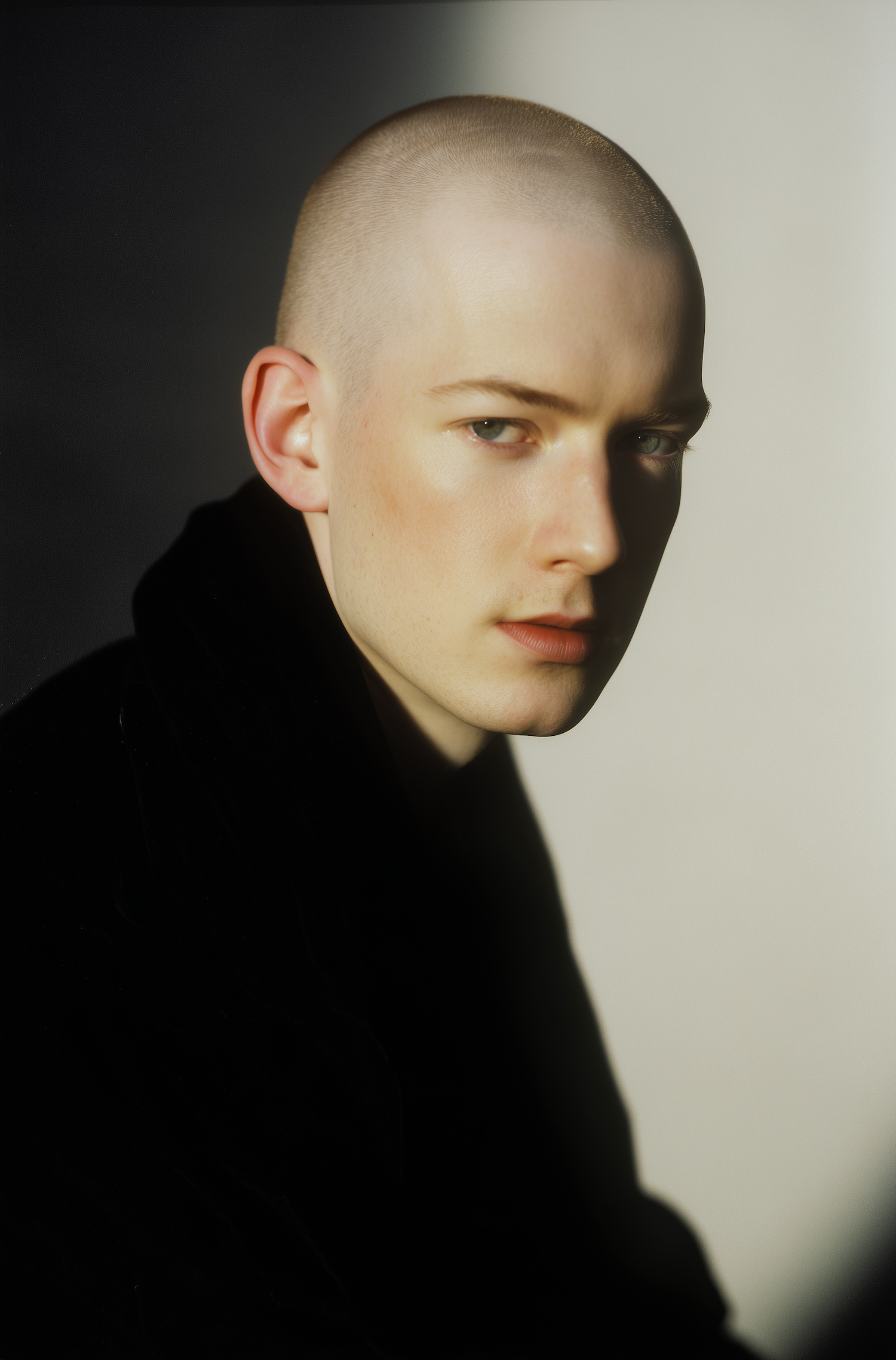 Close-up portrait of a person with a shaved head and green eyes, highlighted by dramatic lighting and a minimalistic background.