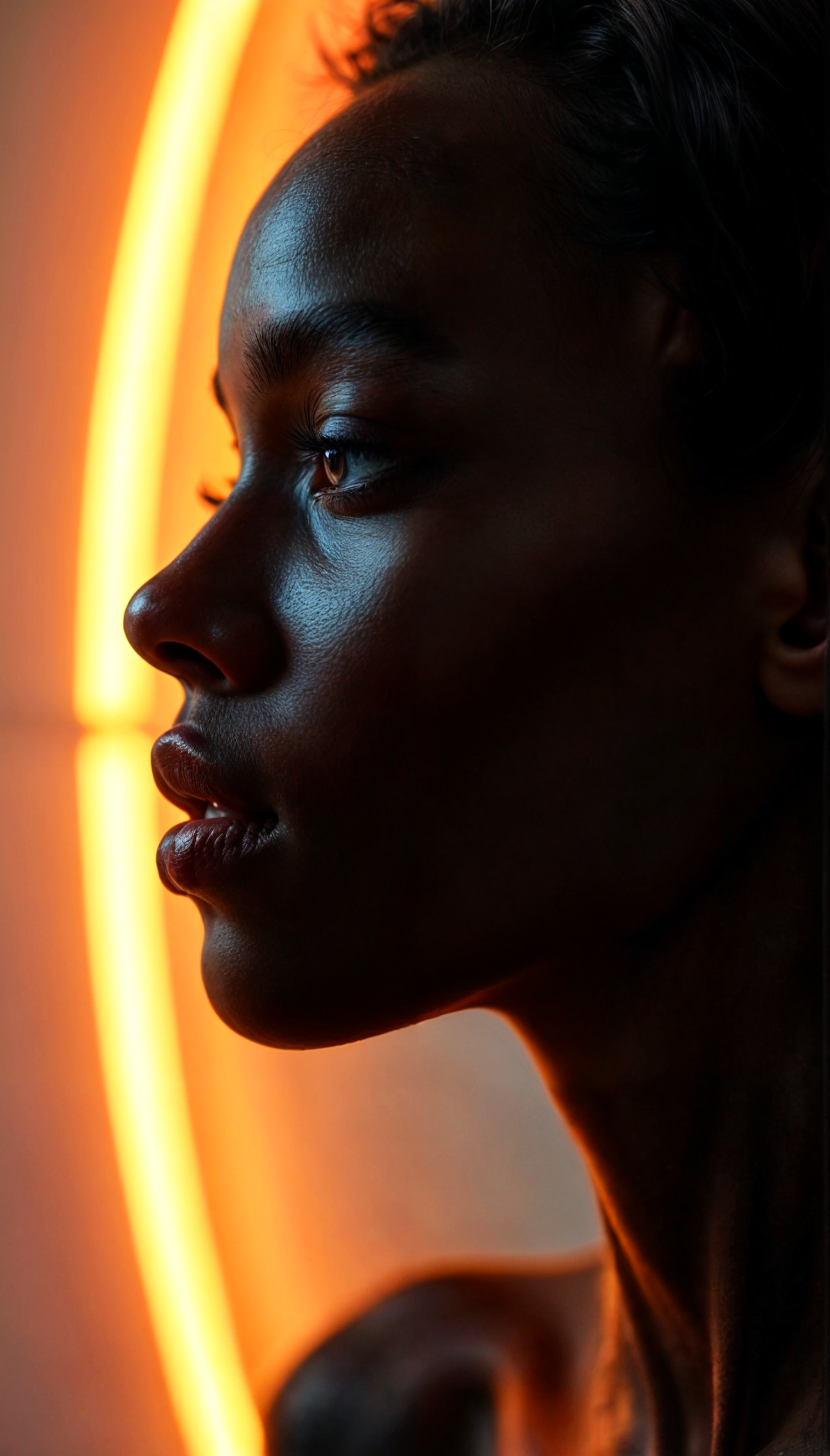 Profile of a woman in warm orange light, highlighting her features against a dark background. Artistic and modern composition.