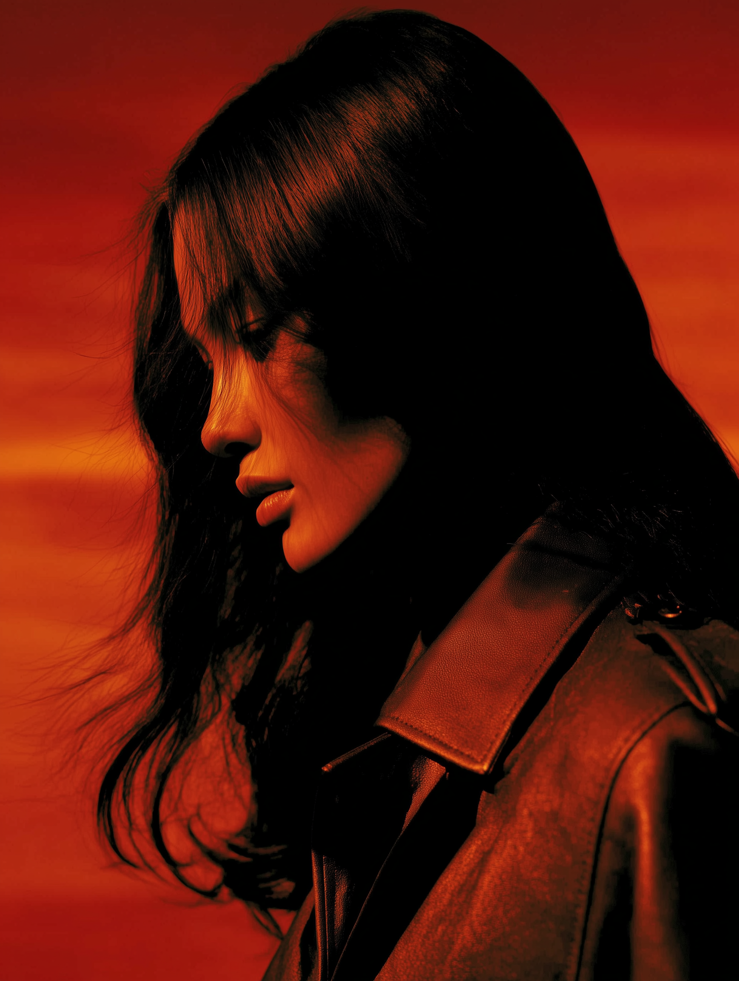 A dramatic profile portrait of a person in a leather jacket, illuminated by warm lighting against a vivid red background.