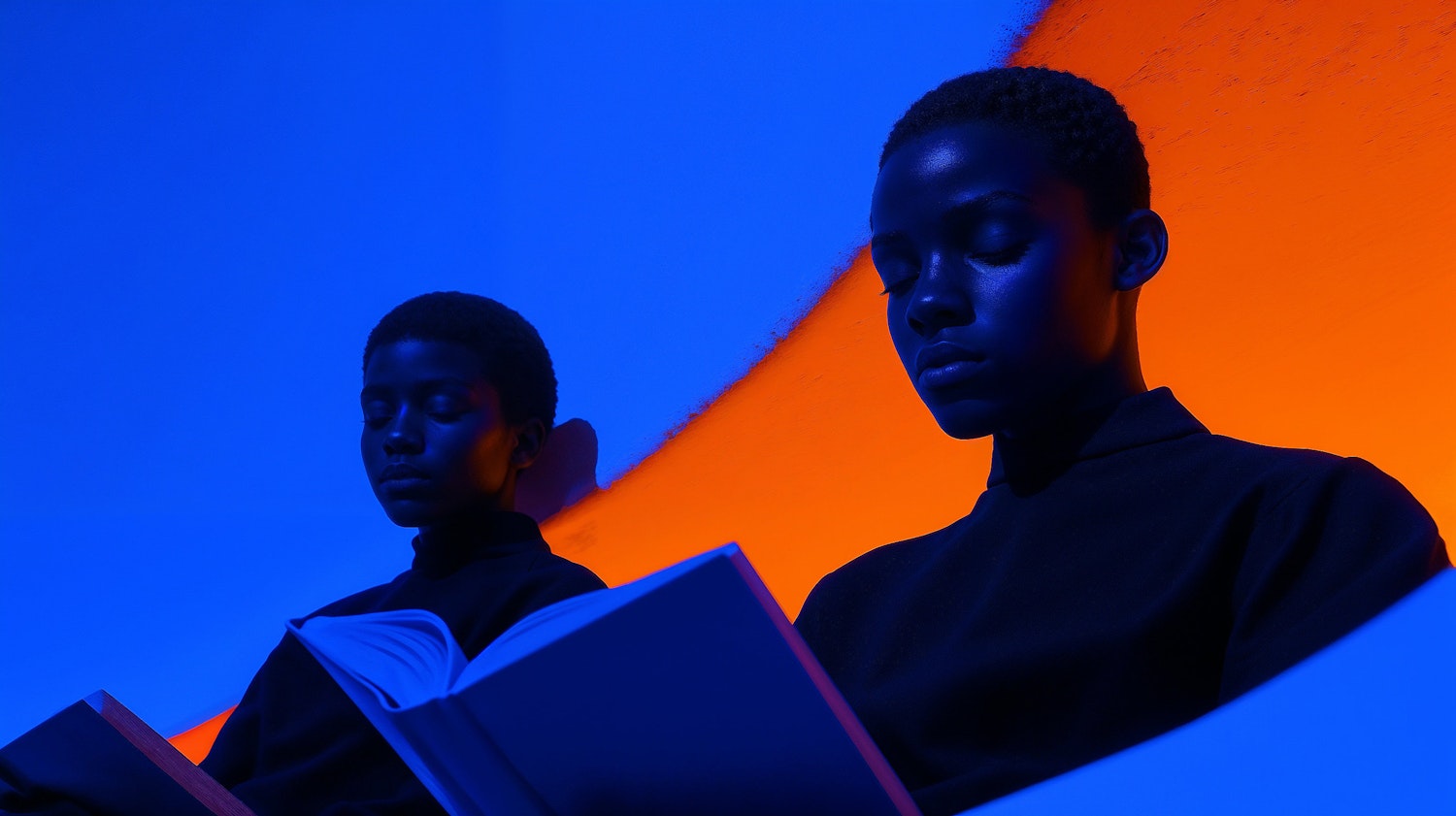 Two individuals reading under vibrant blue lighting against an orange backdrop, creating a striking visual contrast.