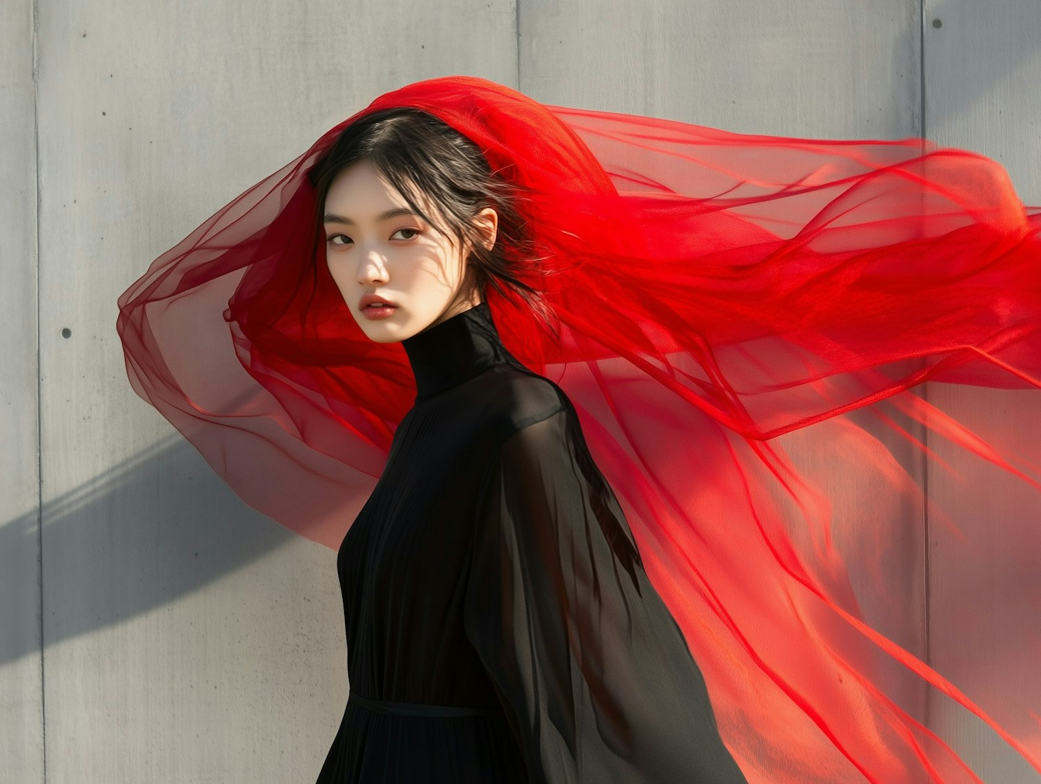 Elegant woman in black dress with red fabric flowing in the wind, creating a striking contrast against a concrete wall.