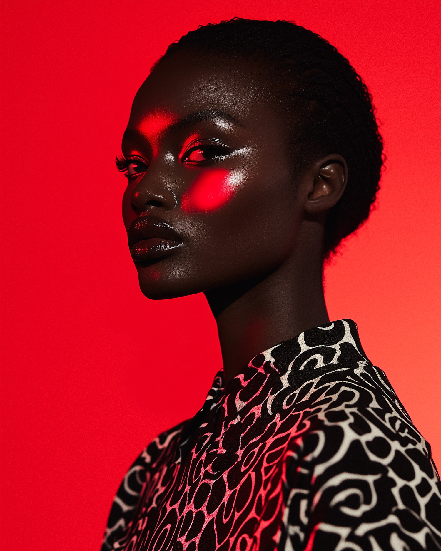 Bold portrait of a woman with glowing skin, red lighting, and a patterned black-and-white shirt against a vivid red background.