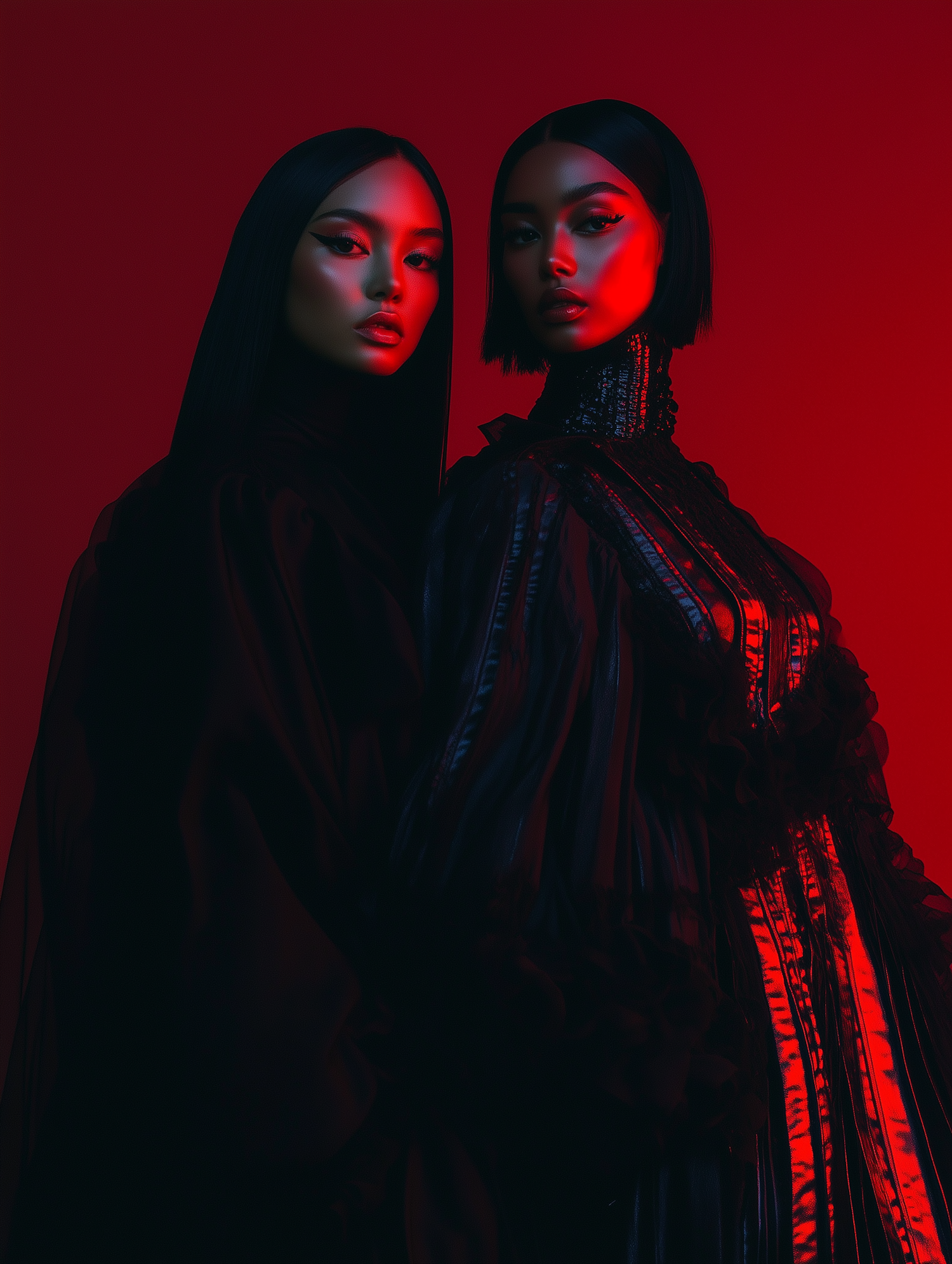 Two women in bold black outfits and dramatic red lighting, featuring sleek hairstyles and striking makeup against a vivid red backdrop.