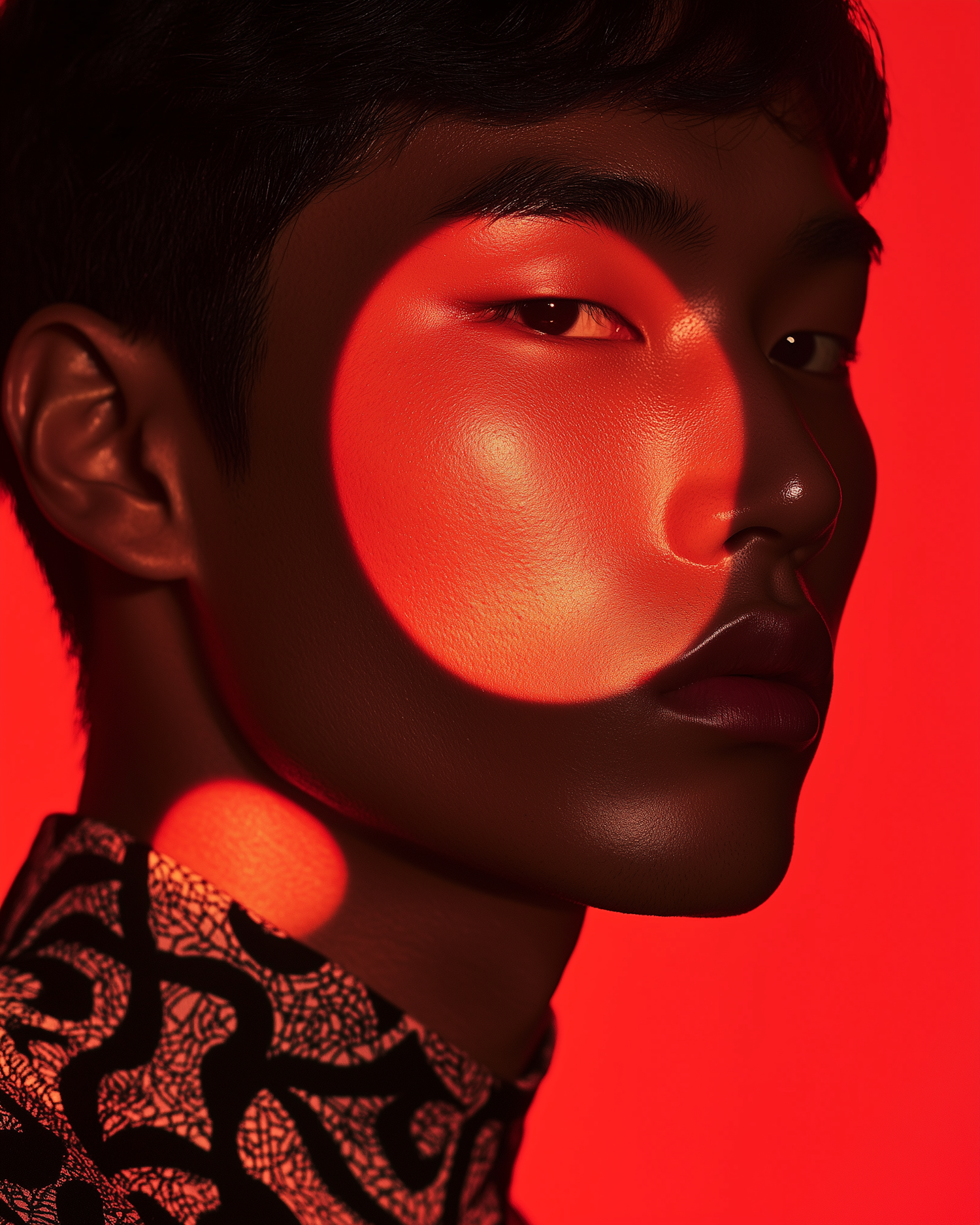 Close-up of an Asian individual with red lighting and bold shadows, wearing a patterned high-collar garment against a vivid red background.