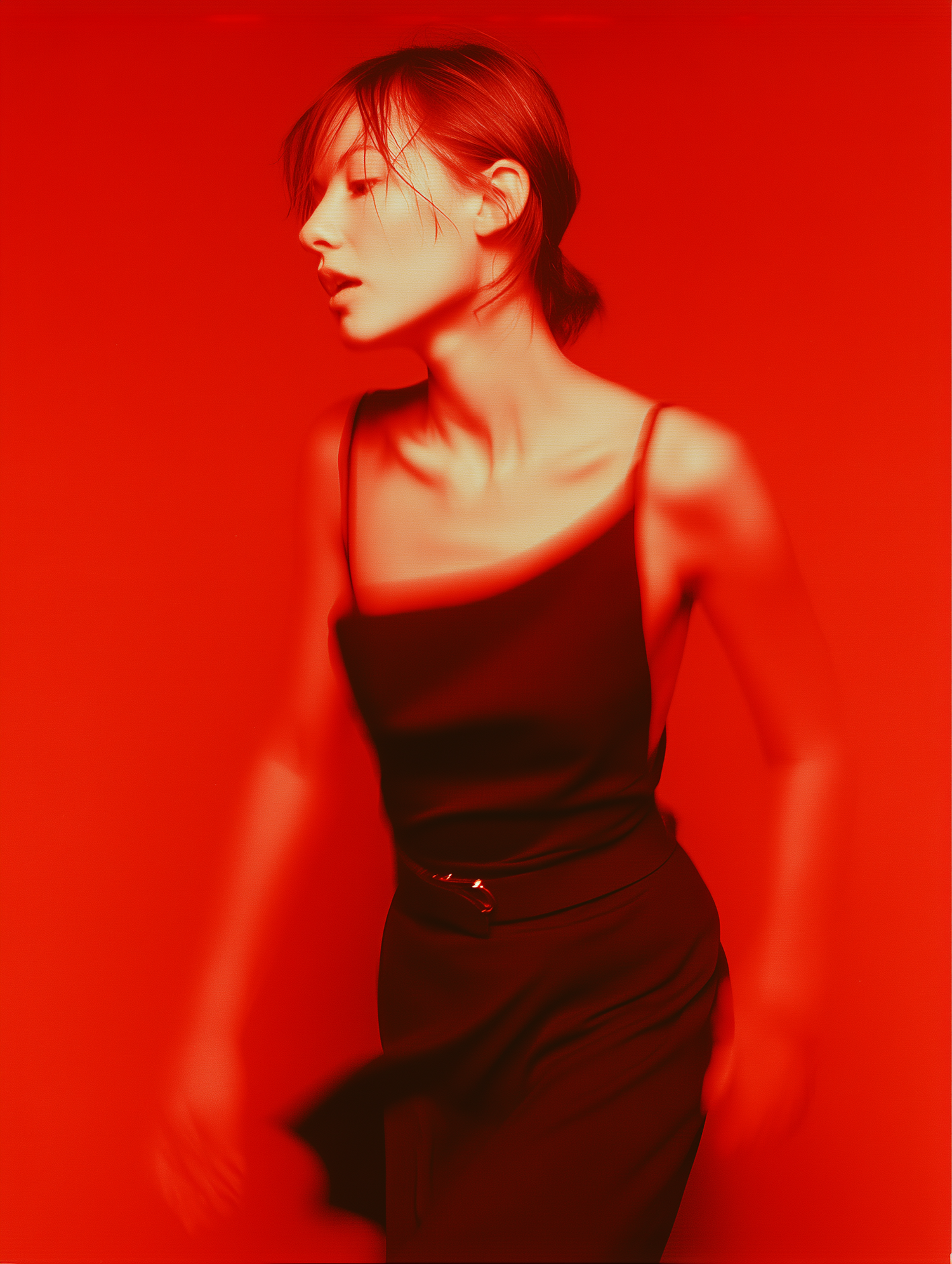 Dynamic portrait of a woman in a black dress against a vivid red background, with motion blur adding energy and artistic flair.