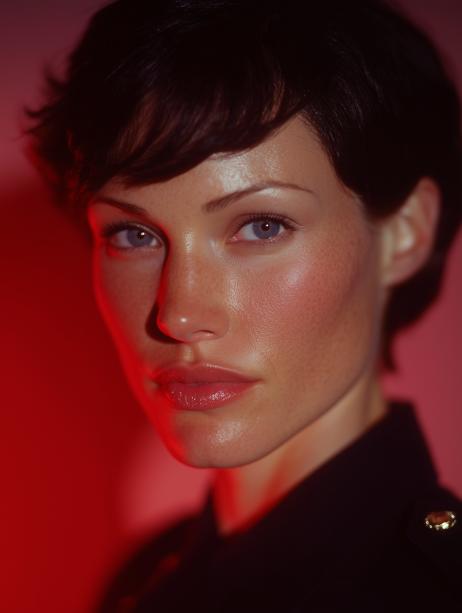 Close-up portrait of a person with short dark hair, blue eyes, and red lighting, creating a dramatic and artistic effect.
