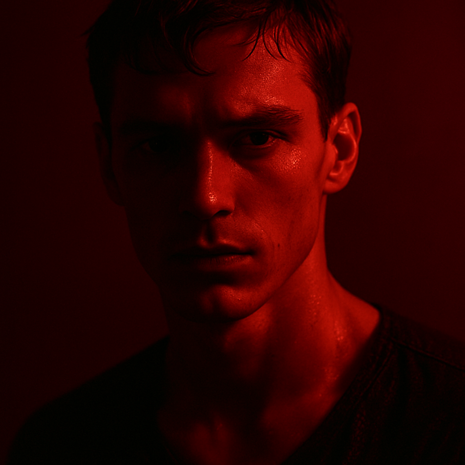 Close-up of a man in dramatic red lighting, showcasing intense facial expression and moody ambiance.