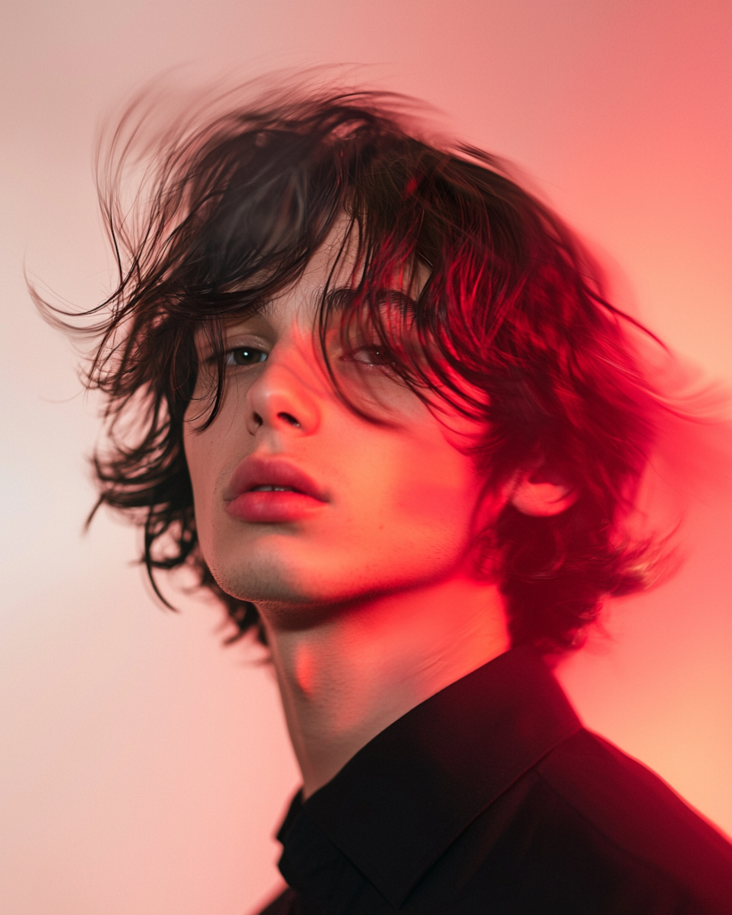 Close-up of a young person with tousled dark hair, dramatic red lighting, and a black shirt, creating a moody and artistic vibe.