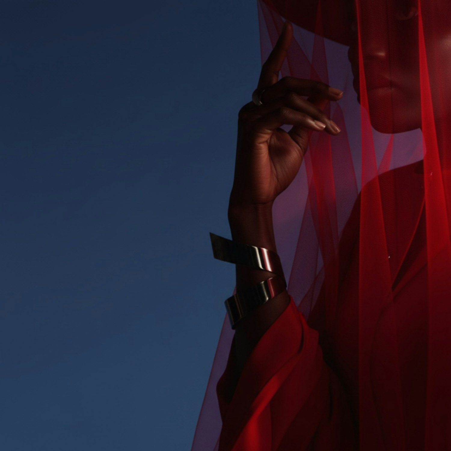 A dramatic portrait of a person behind red fabric, with a raised hand adorned with a metallic bracelet, set against a deep blue background.