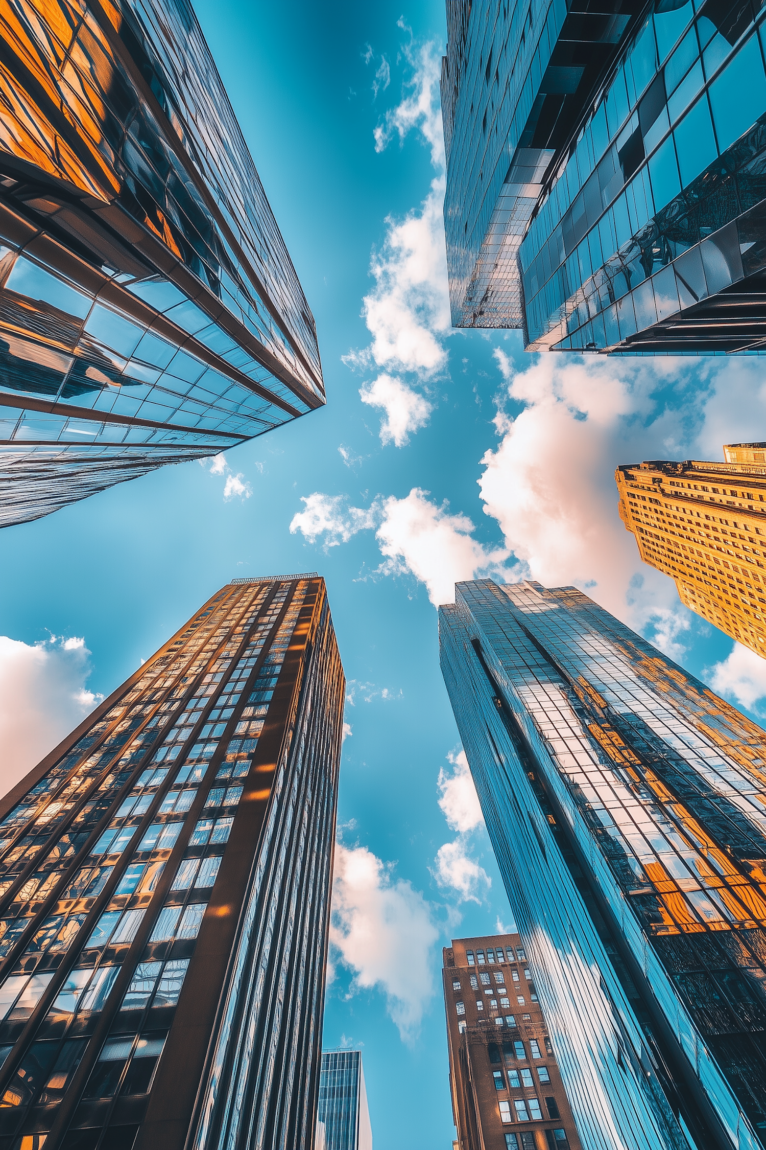 Upward view of skyscrapers with reflective glass facades against a vibrant blue sky and clouds, capturing urban grandeur and architectural beauty.