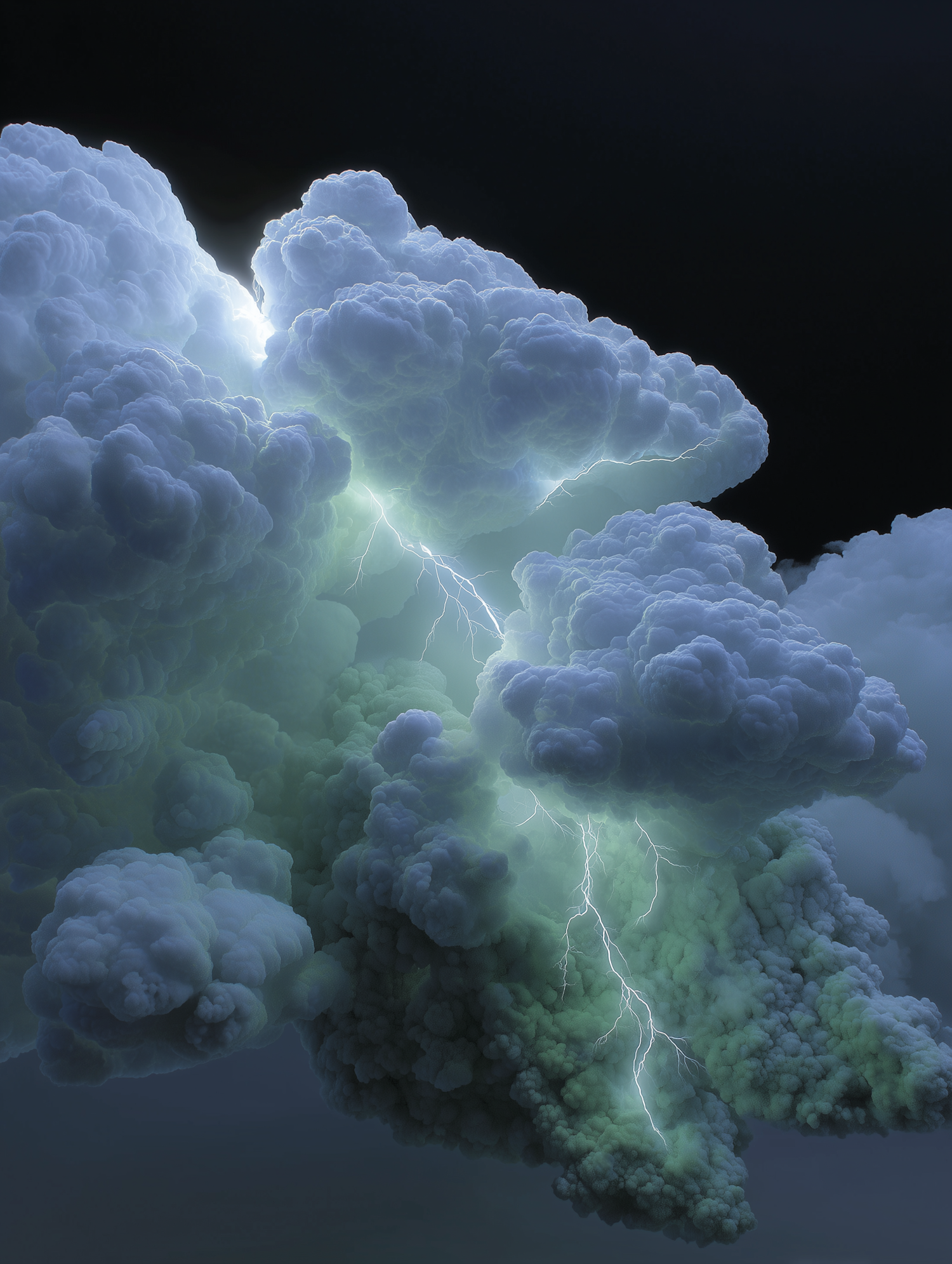 Surreal storm clouds illuminated by lightning, with glowing green and blue hues creating a dramatic and ethereal atmosphere.