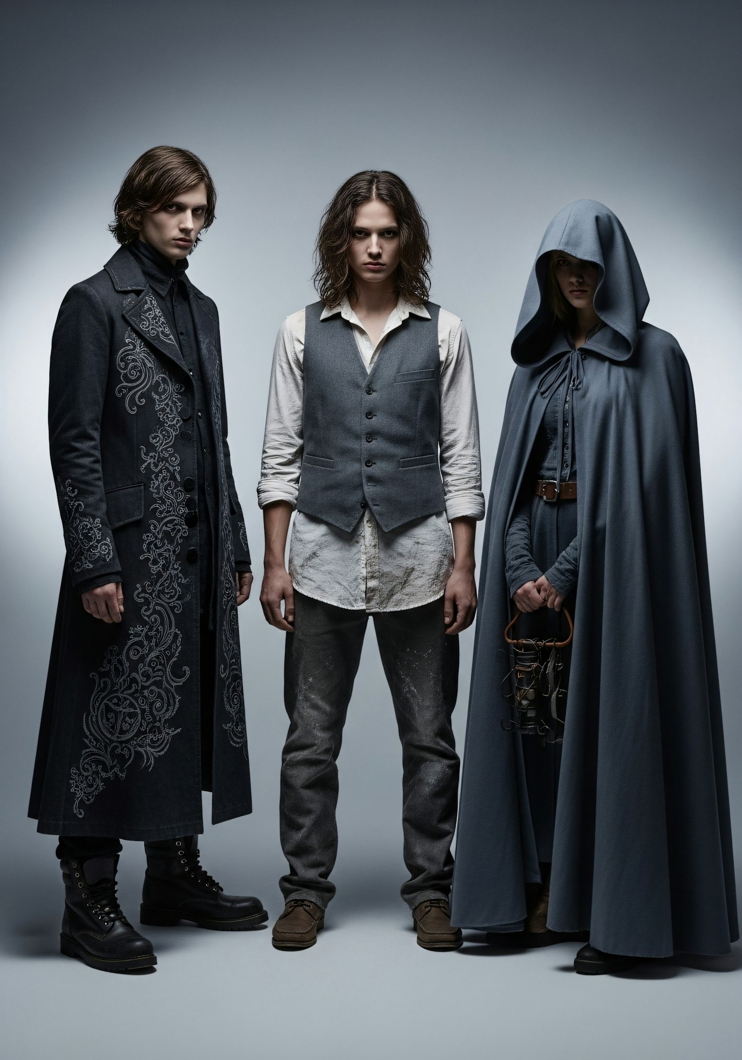 Three individuals in dramatic, dark-toned attire, including a hooded cloak, embroidered coat, and rugged vest, stand in a moody studio setting.
