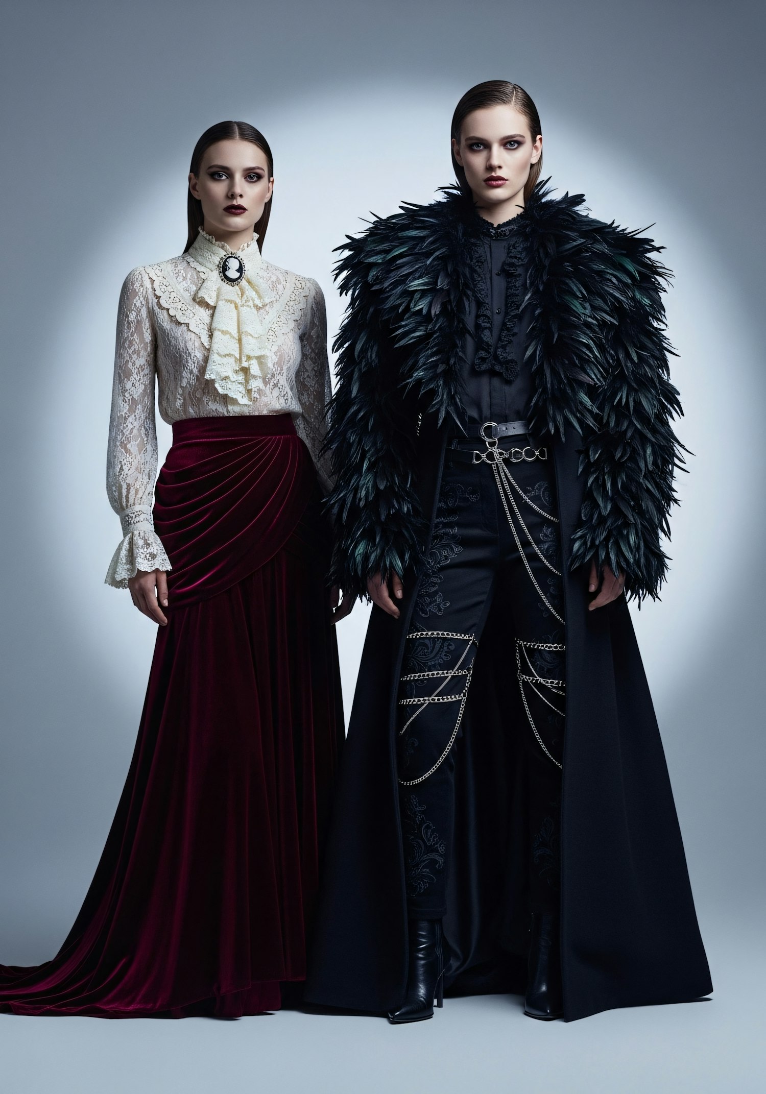 Two individuals in dramatic, contrasting outfits, one in white lace and red velvet, the other in black with feathers and chains, in a studio setting.