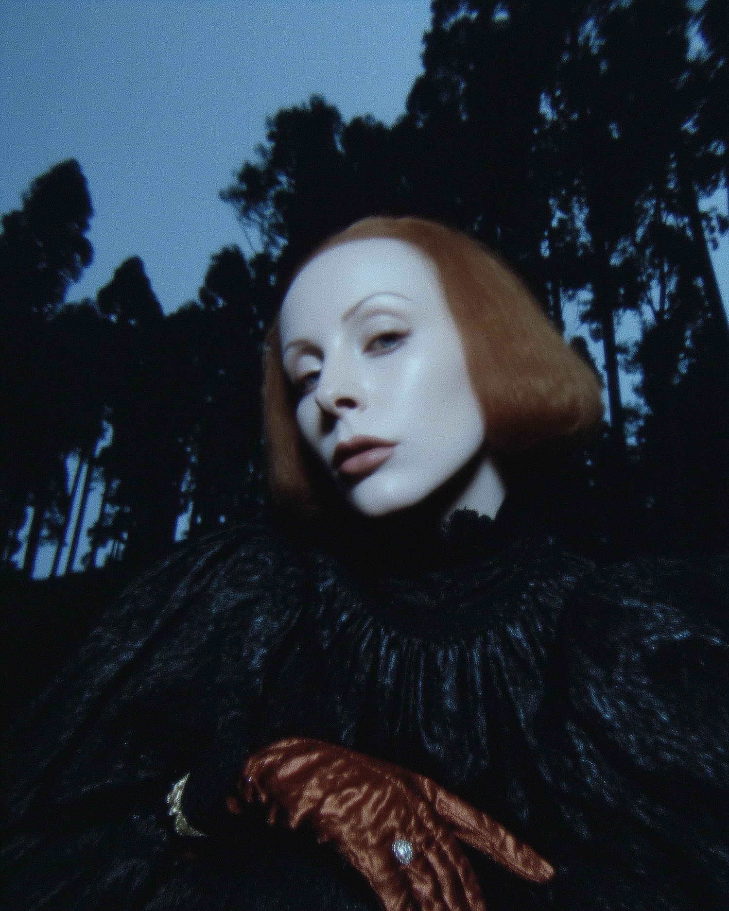 A dramatic portrait of a person with red hair, wearing a black outfit and gloves, set against a twilight forest background.
