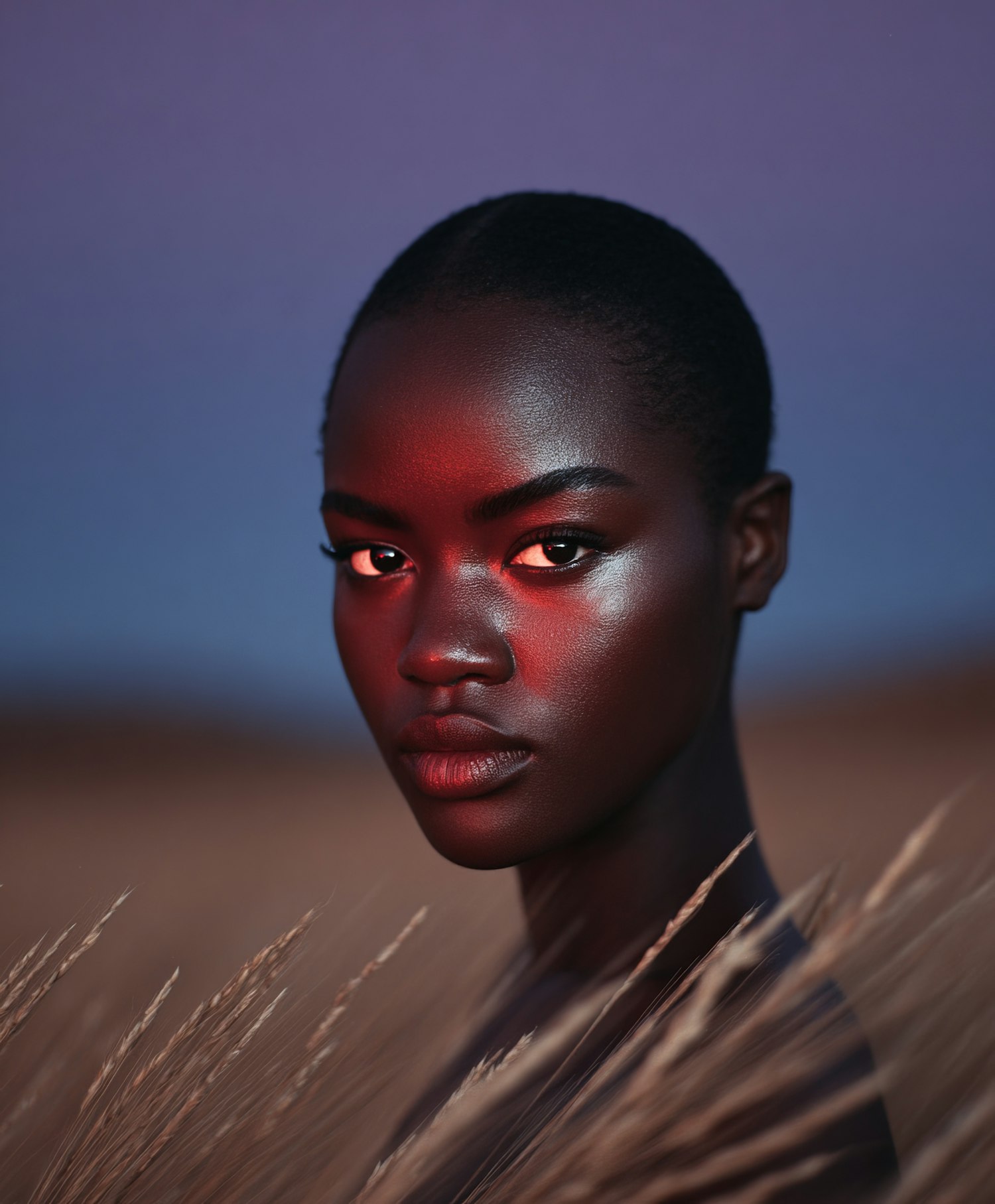 A dramatic portrait of a woman with short hair, glowing under red light, set against a twilight background with golden grass in the foreground.