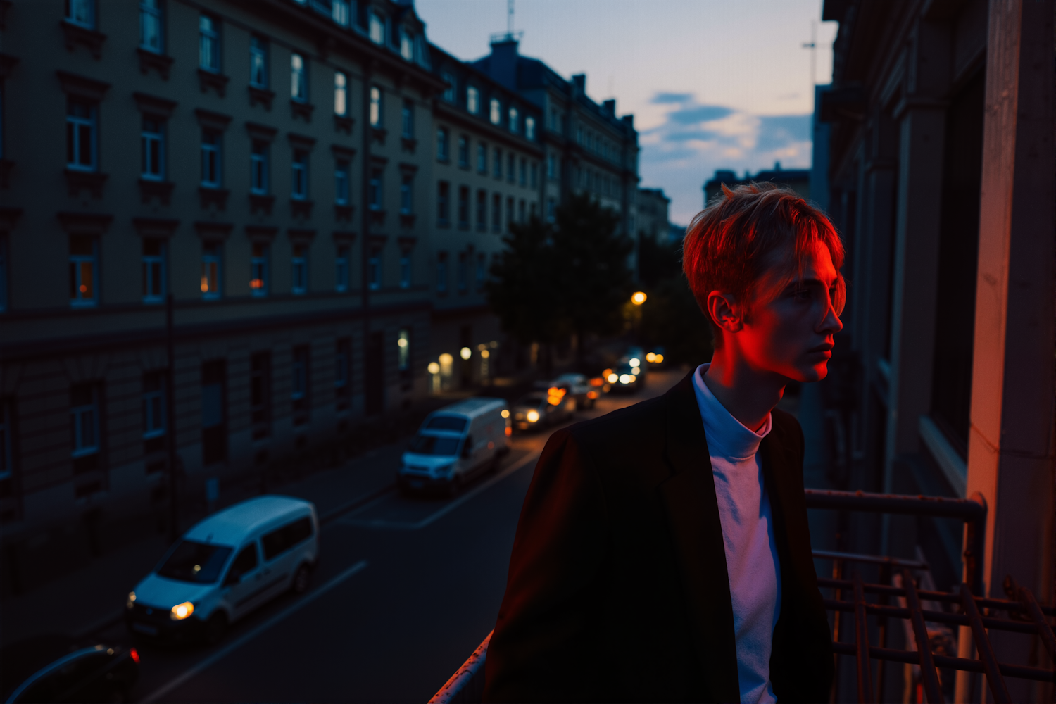 Stylish person in red light on a balcony at dusk, overlooking a city street with cars and classic European buildings.