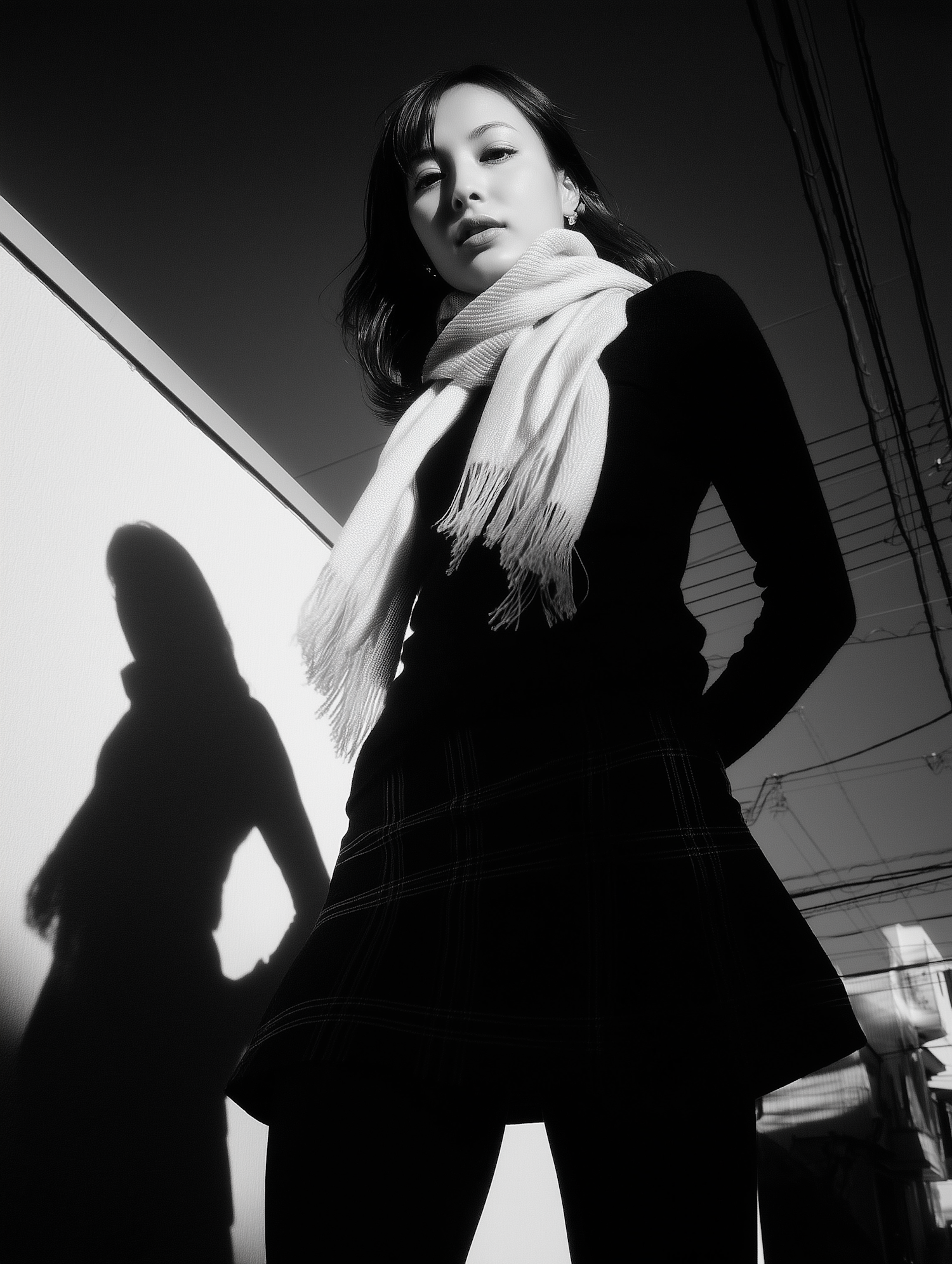 Monochrome photo of a stylish woman in a scarf and plaid skirt, with dramatic shadows and an urban backdrop.
