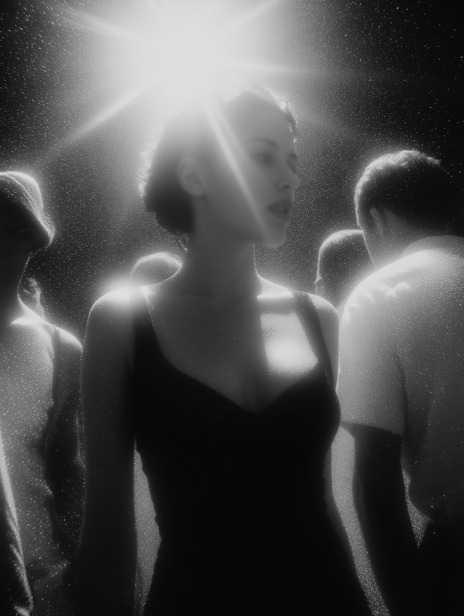 A dramatic black-and-white photo of a woman in a dark dress, illuminated by a bright light, surrounded by a textured, ethereal atmosphere.