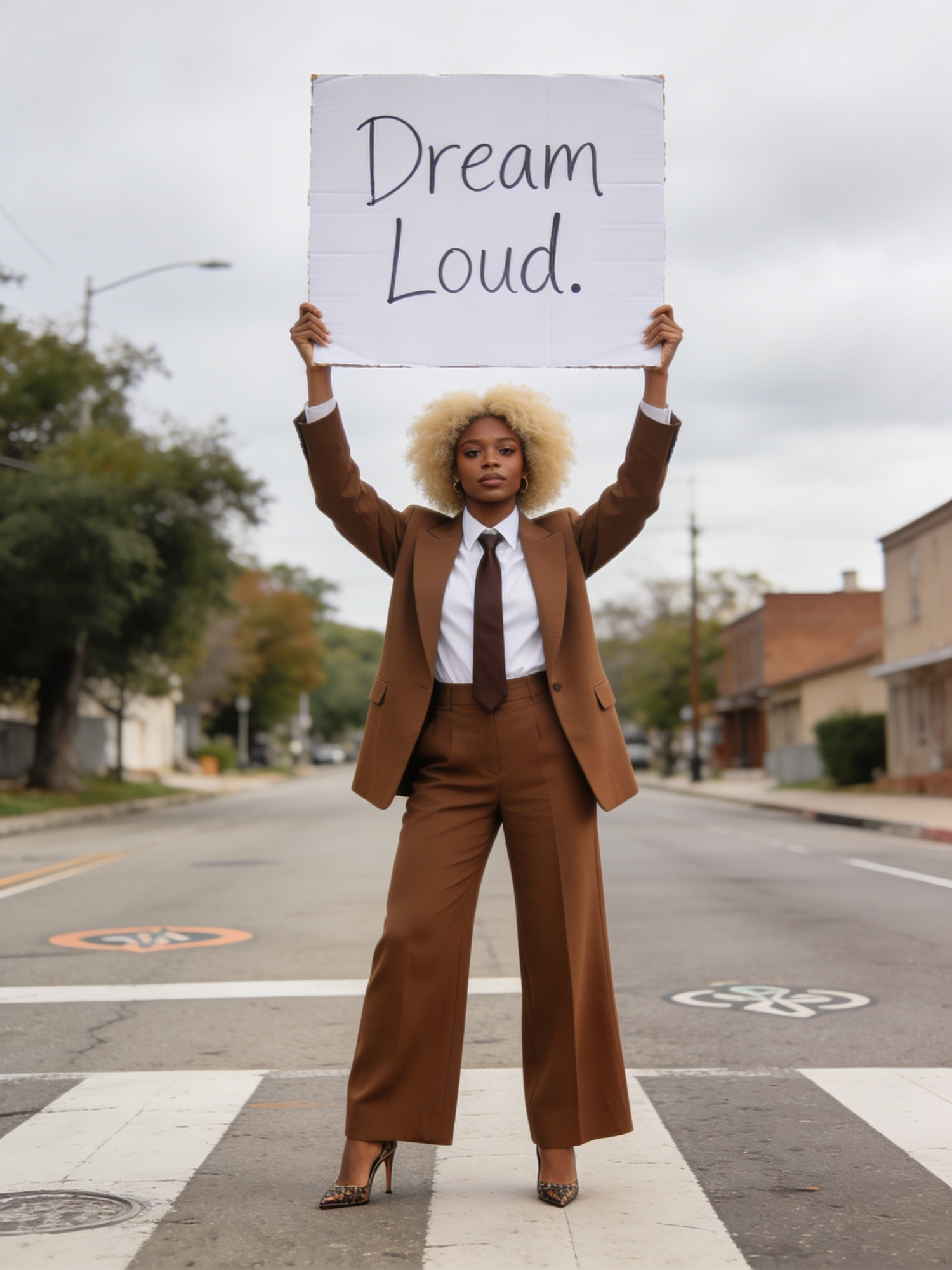 A person in a brown suit holds a 'Dream Loud' sign on a crosswalk, exuding confidence and determination in an urban setting.