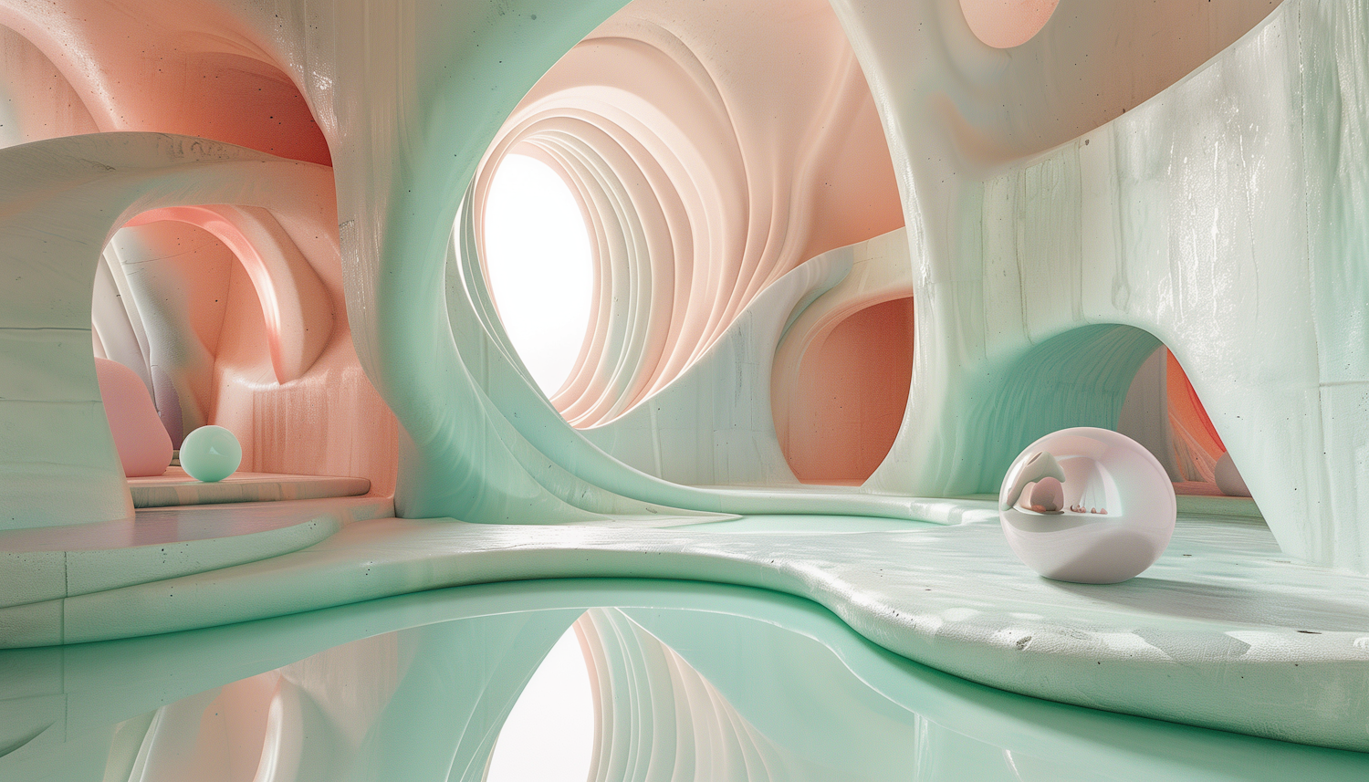 Surreal interior with flowing pastel architecture, featuring soft pink and mint hues, reflective surfaces, and a spherical focal point.