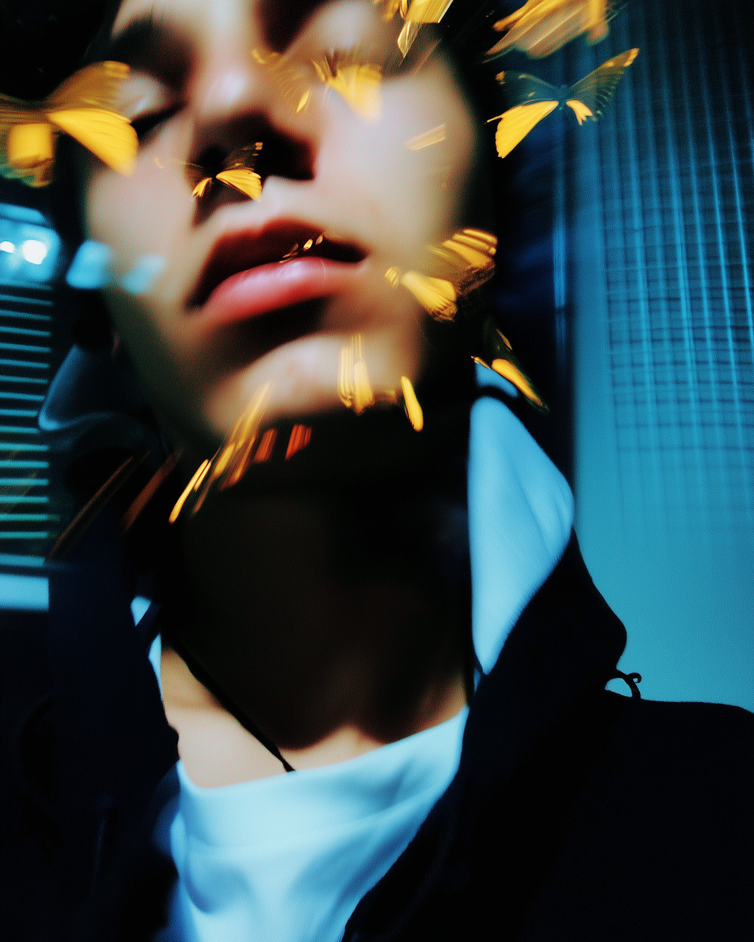 Blurred close-up of a person with glowing golden butterflies, wearing a dark jacket and white hoodie in a surreal, dreamlike setting.