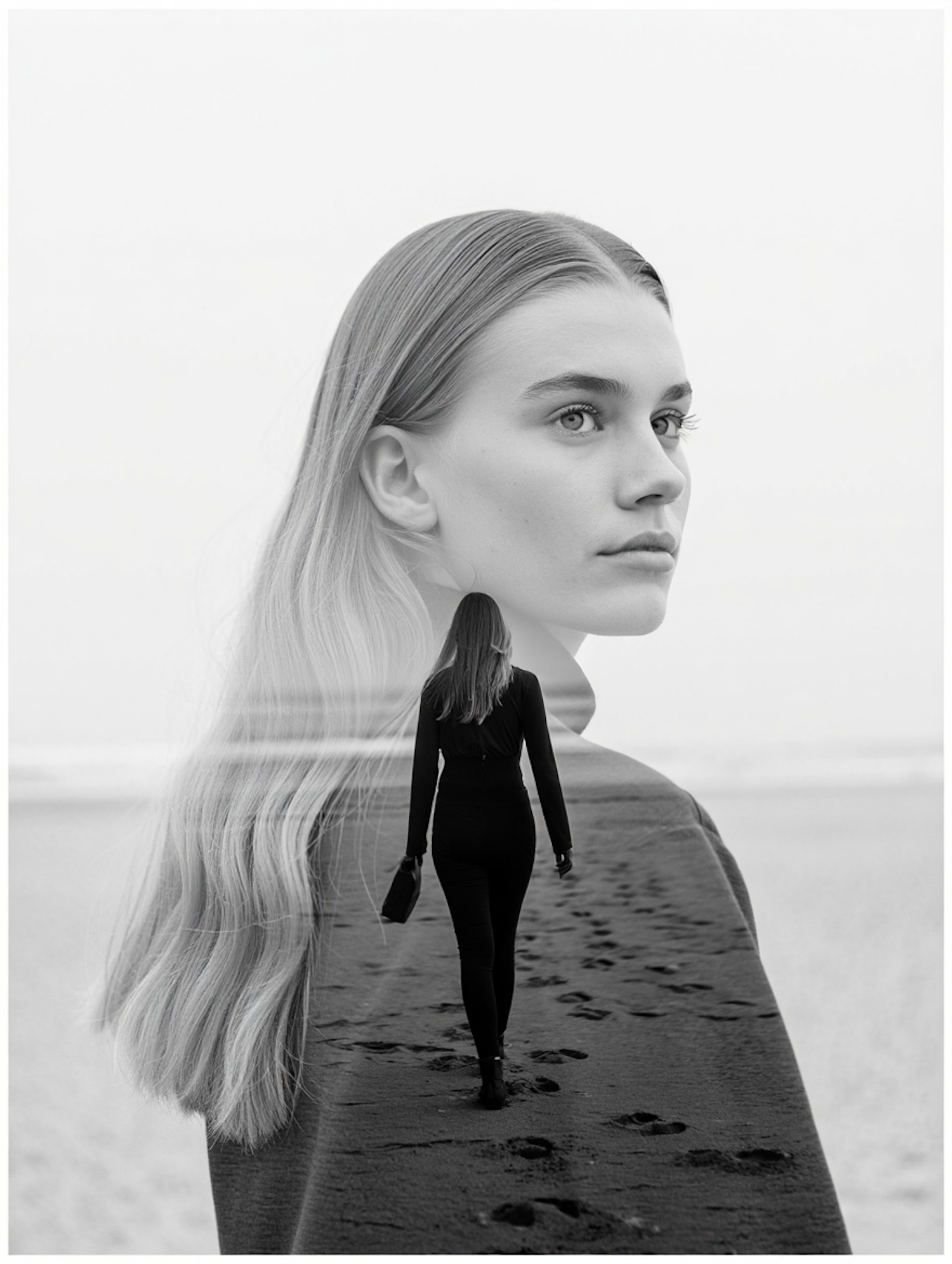 A stunning black-and-white double exposure of a serene woman and a figure walking on a beach, blending introspection and nature.